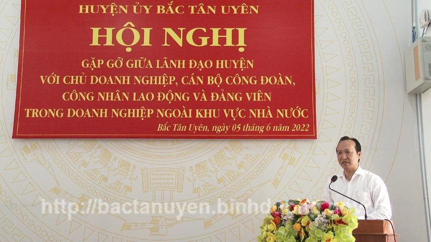 Sáng ngày 5-6, Huyện Bắc Tân Uyên tổ chức Hội nghị gặp gỡ giữa Lãnh đạo huyện với Chủ doanh nghiệp, cán bộ công đoàn, công nhân lao động và đảng viên trong doanh nghiệp ngoài khu vực nhà nước. Dự Hội nghị có ông Trương Văn Phong - Phó Bí thư Huyện ủy, ông Nguyễn Thanh Lâm - Trưởng Ban Tổ chức Huyện ủy, ông Trần Hữu Phúc - Chủ tịch Liên đoàn lao động huyện, lãnh đạo các ban, ngành, đoàn thể huyện, UBND các xã, thị trấn; Giám đốc, cán bộ công đoàn, công nhân lao động và đảng viên các Công ty trong doanh nghiệp ngoài khu vực nhà nước; Bí thư chi đoàn các xã, thị trấn trên địa bàn huyện.