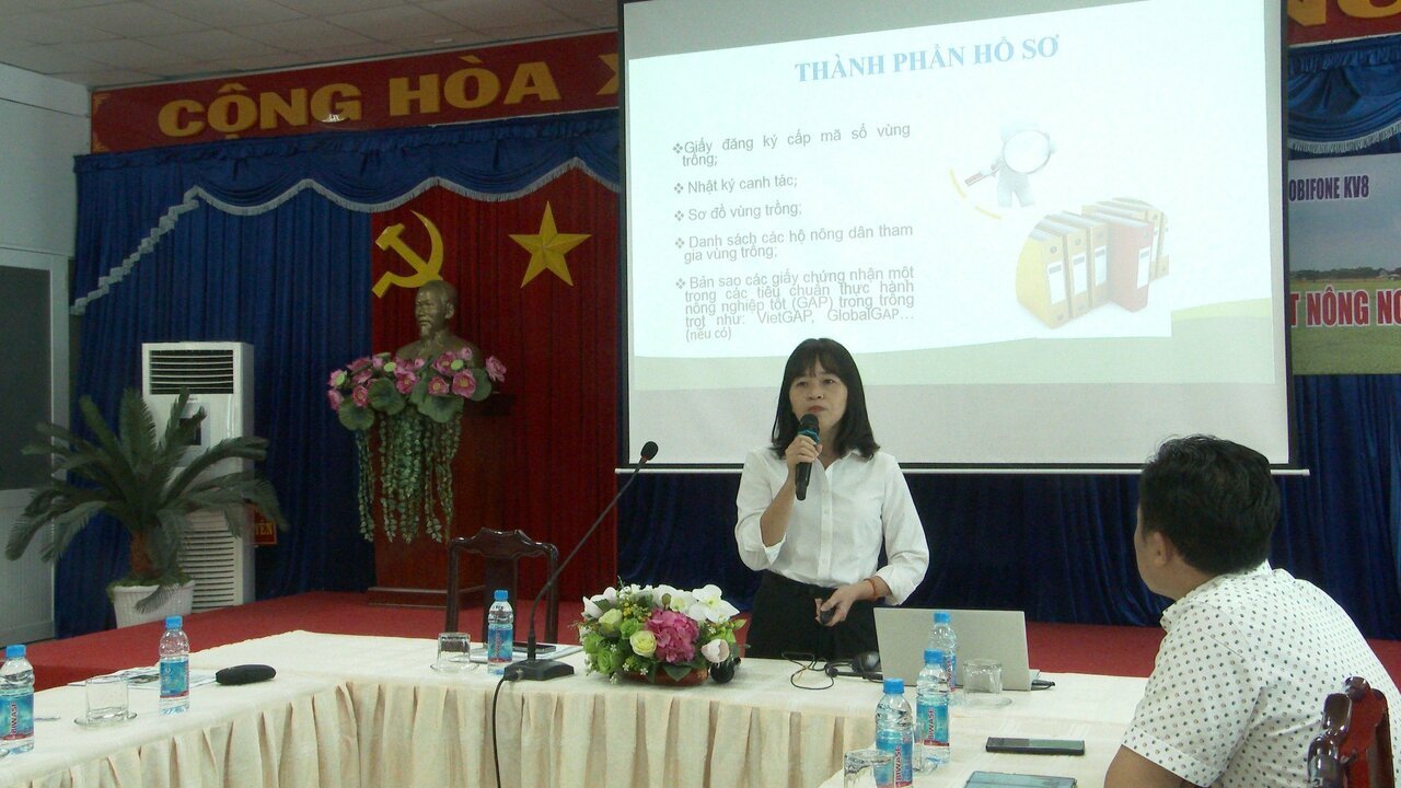 Tham gia hội nghị, các đại biểu được bà Phạm Đỗ Bích Quyên-Phó Chi cục trưởng Chi cục Trồng trọt và Bảo vệ thực vật tỉnh triển khai, hướng dẫn một số nội dung liên quan đến việc đăng ký, cấp mã số vùng trồng như hồ sơ, thủ tục cấp mã số vùng trồng trong nước; quy trình cấp mã, cấu trúc mã số vùng trồng trong nước; yêu cầu đối với vùng trồng, cơ sở đóng gói phục vụ xuất khẩu, công tác kiểm tra, giám sát; cấu trúc mã số, thu hồi mã số đối với vùng trồng và cơ sở đóng gói phục vụ xuất khẩu. Ngoài ra, các đại biểu cũng được đại diện Công ty dịch vụ Mobiphone khu vực 8 hướng dẫn một số nội dung liên qua đến giải pháp truy xuất nguồn và quản trị sản xuất bằng công nghệ Blocchain; giới thiệu tổng quan về dịch vụ MobiAgri, tính năng nổi bật, những hoạt động, gói cước của MobiAgri, hướng dẫn cách cài đặt và cách sử dụng phần mềm.