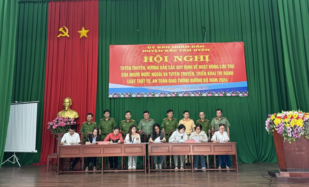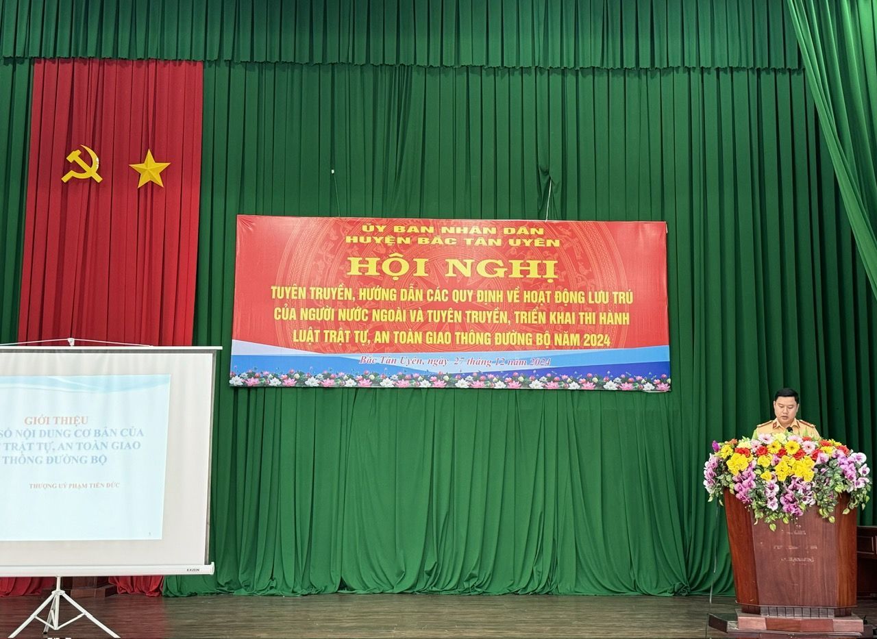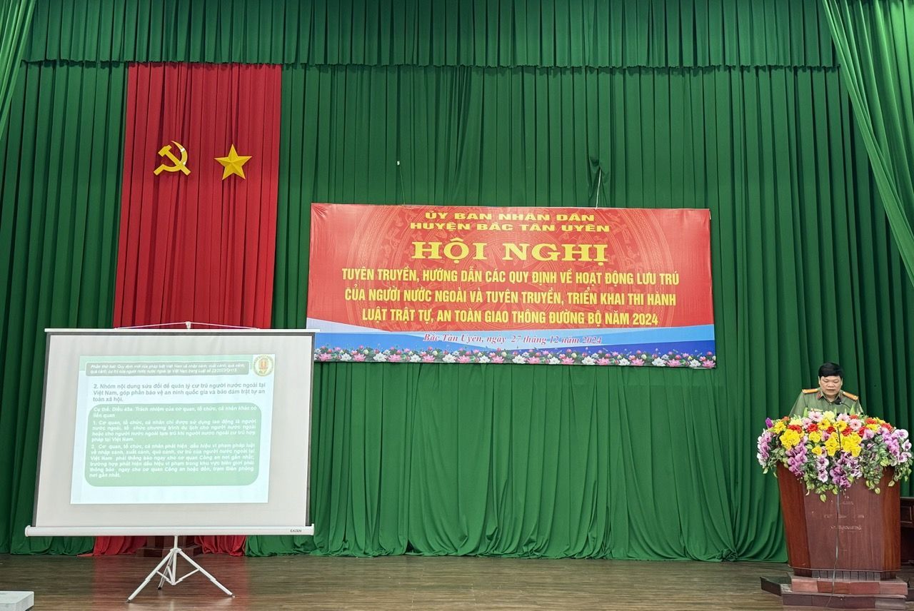 Sáng 27/12, tại Trung tâm Chính trị huyện, Công an huyện Bắc Tân Uyên tổ chức Hội nghị tuyên truyền hướng dẫn các quy định về hoạt động lưu trú của người nước ngoài và tuyên truyền, triển khai thi hành luật trật tự, ATGT đường bộ năm 2024. Tham dự hội nghị có Thượng tá Võ Thành Trung - UVTV Huyện ủy, Trưởng Công an huyện; đại diện các phòng, ban chuyên môn Công an tỉnh, huyện; Trưởng Công an các xã, thị trấn trong huyện và hơn 200 đại biểu đại diện cho các cơ quan, trường học, tổ chức, doanh nghiệp trên địa bàn huyện.