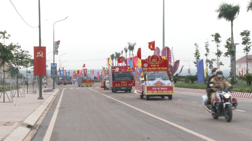 Xe hoa của các đơn vị tuyên truyền cổ động trên các trục đường chính của huyện