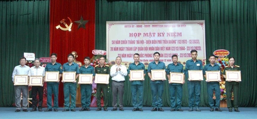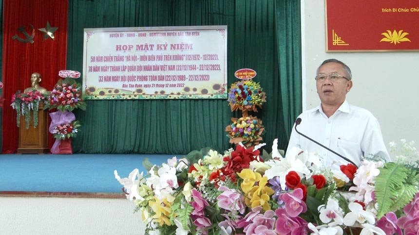 Sáng ngày 21-12, huyện Bắc Tân Uyên tổ chức buổi họp mặt Kỷ niệm 50 năm Chiến thắng “Hà Nội - Điện Biên Phủ trên không” (12/1972 - 12/2022), 78 năm Ngày thành lập Quân đội nhân dân Việt Nam (22/12/1944 - 22/12/2022), 33 năm Ngày hội Quốc phòng toàn dân (22/12/1989 - 22/12/2022). Dự buổi họp mặt có Thượng tá Phùng Thanh - Phó chủ nhiệm Chính trị, Bộ Chỉ huy quân sự tỉnh, ông Thái Thanh Bình - Bí thư Huyện ủy, Chủ tịch UBND huyện, các đồng chí cách mạng lão thành, Cựu Chiến binh, cán bộ Quân đội qua các thời kỳ, lãnh đạo các Ban, ngành, đoàn thể huyện, các xã – thị trấn.