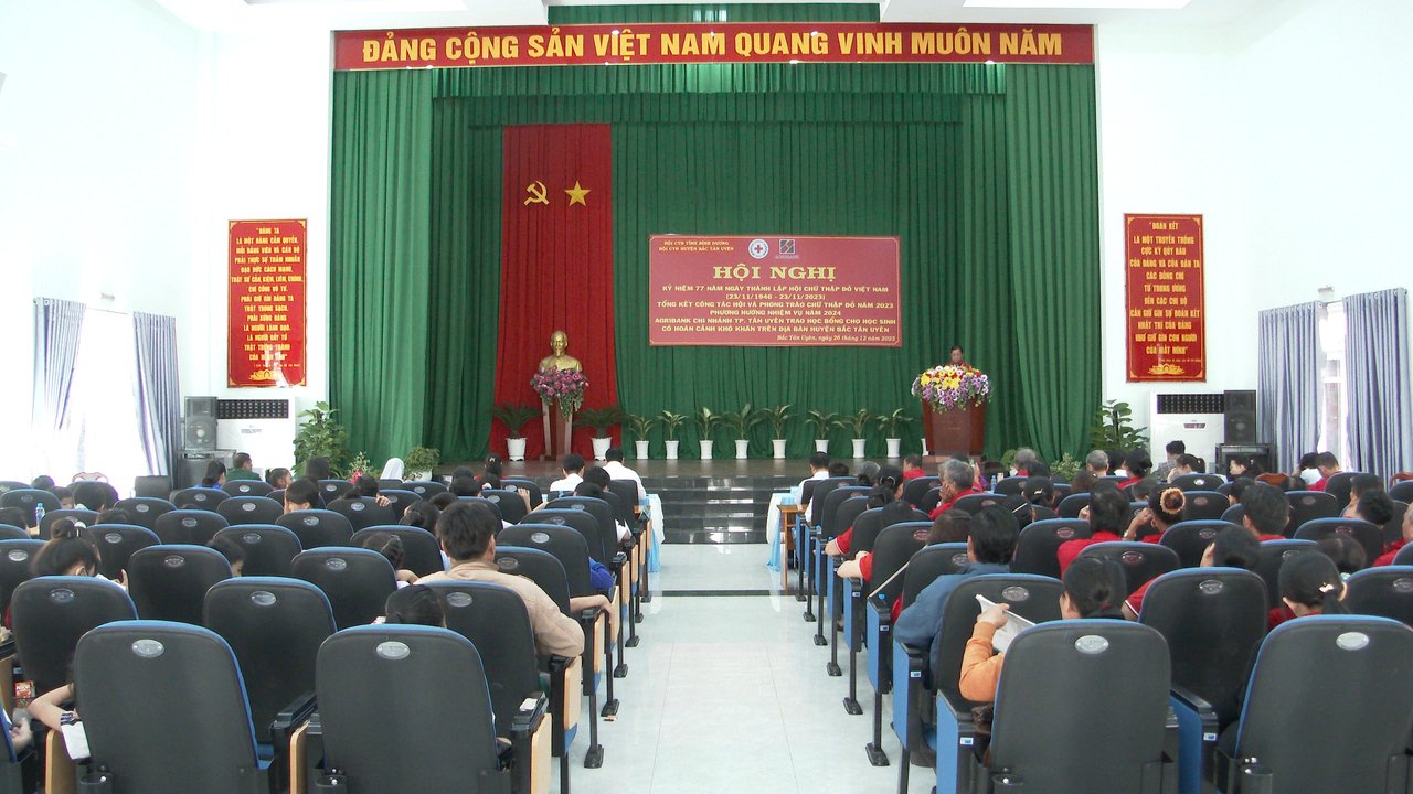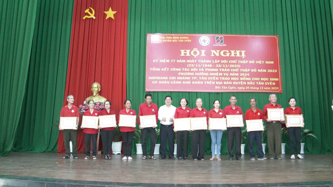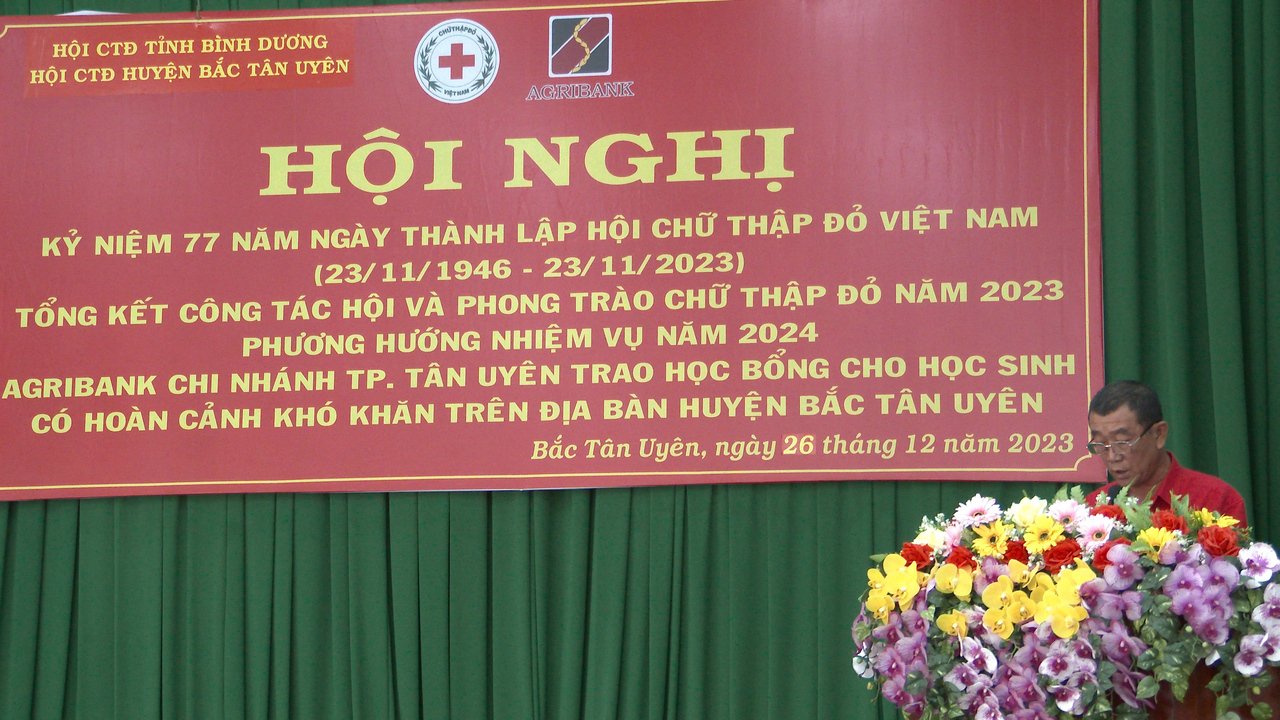 Sáng ngày 26/12, Hội Chữ thập đỏ huyện Bắc Tân Uyên tổ chức hội nghị kỷ niệm 77 năm Ngày thành lập hội Chữ thập đỏ Việt Nam 23/11/1946-23/11/2023 và tổng kết công tác hội, Phong trào Chữ thập đỏ huyện năm 2023. Dự hội nghị có ông Võ Văn Tính-Phó Bí thư Thường trực Huyện ủy-Chủ tịch HĐND huyện, ông Trần Văn Phương-Ủy viên Thường vụ Huyện ủy-Phó Chủ tịch UBND huyện, đại diện Ngân hàng AGRIBAN chi nhánh thành phố Tân Uyên, lãnh đạo các ngành, đoàn thể huyện, cán bộ các cơ sở hội Chữ thập đỏ trên địa bàn huyện.