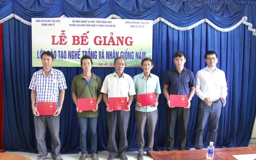Sáng ngày 9-12, Trường Cao đẳng Công nghệ và Nông lâm Nam bộ phối hợp cùng Phòng Kinh tế huyện Bắc Tân Uyên tổ chức bế giảng lớp đào tạo nghề trồng và nhân giống nấm cho 25 lao động nông thôn trên địa bàn xã Lạc An. Tham dự lễ bế giảng có ông Lê Châu Ra - Phó Trưởng Phòng Kinh tế huyện; ông Nguyễn Quang Huy - Phó Hiệu trưởng Trường Cao đẳng Công nghệ và Nông lâm Nam bộ.