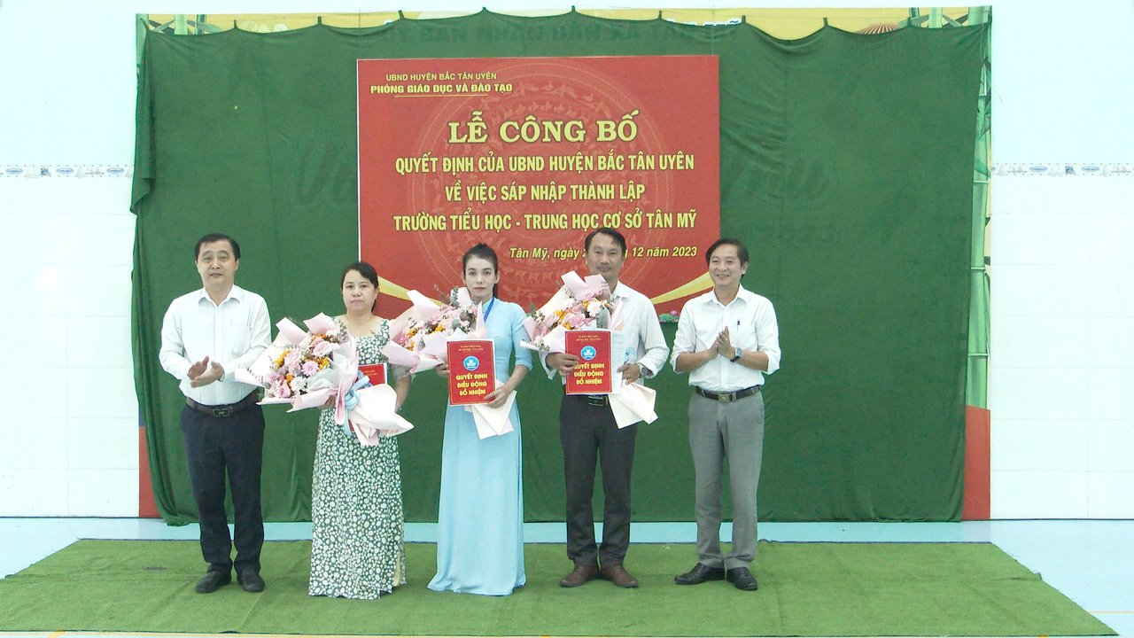 Tại buổi lễ, đại diện Phòng Nội vụ huyện đã công bố Quyết định của Ủy ban nhân dân huyện Bắc Tân Uyên về việc sáp nhập Trường tiểu học Huỳnh Thị Chấu và Trường THCS Tân Mỹ thành Trường Tiểu học và THCS Tân Mỹ. Theo đó, Trường Tiểu học và Trung học cơ sở Tân Mỹ là cơ sở giáo dục phổ thông thuộc hệ thống giáo dục quốc dân, trực thuộc UBND huyện Bắc Tân Uyên. Trường chịu sự chỉ đạo, quản lý trực tiếp về các hoạt động chuyên môn nghiệp vụ của Phòng Giáo dục và Đào tạo huyện; đồng thời chịu sự chỉ đạo, hướng dẫn, thanh tra về chuyên môn nghiệp vụ của cơ quan Nhà nước có thẩm quyền. Trường mới thành lập đều là cơ sở giáo dục của hệ thống giáo dục quốc dân, có tư cách pháp nhân, có tài khoản và con dấu riêng; tổ chức và hoạt động theo quy định của pháp luật.