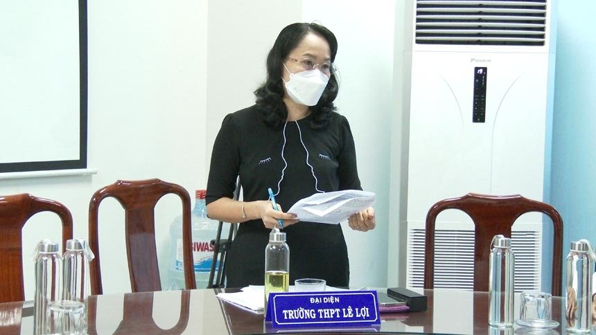 Bà Phạm Thị Tùng Oanh – Hiệu trưởng trường THPT Lê Lợi báo cáo