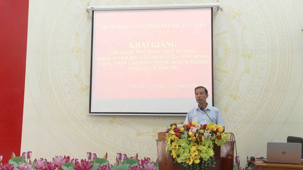 Sáng ngày 23-6, Trung tâm Chính trị huyện Bắc Tân Uyên phối hợp với Liên đoàn Lao động huyện tổ chức khai giảng lớp bồi dưỡng nhận thức về Đảng khóa II năm 2024 cho hơn 100 quần chúng ưu tú đến từ các Chi bộ, Đảng bộ trong doanh nghiệp ngoài quốc doanh. Tham dự lễ khai giảng có đồng chí Lưu Hữu Duyên- UVTV Huyện ủy,Trưởng Ban Tuyên giáo Huyện ủy, Giám đốc Trung tâm Chính trị huyện; đồng chí Trần Hữu Phúc- HUV, Chủ tịch LĐLĐ huyện.