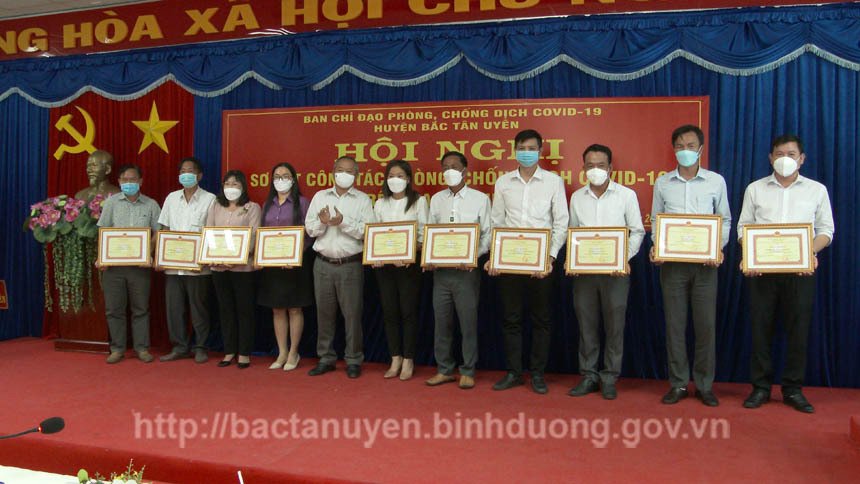 Đến thời điểm hiện tại, toàn huyện Bắc Tân Uyên có 5.403 trường hợp F0 và đã điều trị khỏi trên 4.500 bệnh nhân, đang cách ly điều trị và theo dõi tại nhà 449 trường hợp; Đã tiêm được trên 123.000 liều cho hơn 65.000 người, đạt 99,8% trong diện được tiêm và đạt 80% dân số toàn huyện; UBND huyện đã kịp thời đưa vào hoạt động Trạm Y tế lưu động của tất cả 10/10 xã - thị trấn trên địa bàn huyện và 2 Trạm Y tế lưu động tại 02 Khu Công nghiệp theo đúng chỉ đạo của Tỉnh; Phòng Lao động – Thương binh và Xã hội huyện đã chi hỗ trợ các gói an sinh xã hội cho tổng cộng trên 43.000 lượt trường hợp, với tổng số tiền là hơn 51 tỷ đồng đến người dân gặp khó khăn do dịch bệnh Covid-19… Dịp này, UBND huyện cũng đã trao Giấy khen cho 24 tập thể và 301 cá nhân đã có thành tích xuất sắc trong công tác phòng chống dịch bệnh Covid-19.