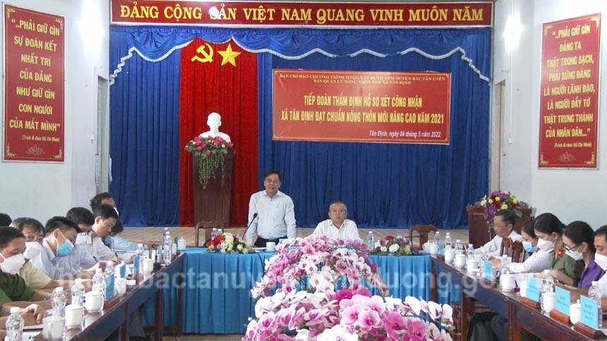 Tại mỗi nơi đến làm việc, đoàn đã tiến hành thẩm định hồ sơ và khảo sát thực tế kết quả thực hiện 19 tiêu chí xã nông thôn mới nâng cao theo quy định. Theo báo cáo kết quả xây dựng nông thôn mới nâng cao năm 2021 trên địa bàn xã Tân Định, địa phương được công nhận đạt chuẩn nông thôn mới tại Quyết định số 3025/QĐ-UBND ngày 18 tháng 11 năm 2015 của UBND tỉnh về việc công nhận xã đạt chuẩn nông thôn mới năm 2015. Tiếp tục thực hiện nâng chất các tiêu chí nông thôn mới theo Quyết định số 1925/QĐ-UBND ngày 16/7/2018 của UBND tỉnh Bình Dương về ban hành Bộ tiêu chí Quốc gia về xã nông thôn mới nâng cao tỉnh Bình Dương giai đoạn 2018 – 2020. Đến nay, xã Tân Định đã thực hiện đạt 19/19 tiêu chí đề ra. Hiện xã Tân Định có 1.698 hộ với 7.646 nhân khẩu. Với Tổng diện tích đất tự nhiên 8.556,94 ha, trong đó, đất nông nghiệp 7.611,15ha, chiếm 88,95%; Cơ cấu kinh tế của xã được quy hoạch theo hướng nông nghiệp và dịch vụ, với tỷ trọng nông nghiệp chiếm 84%.