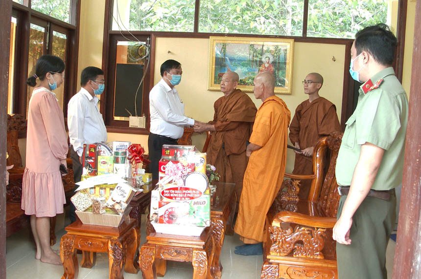 Đoàn đã thăm hỏi, tặng quà và gửi lời chúc mừng tốt đẹp đến các vị trụ trì, cùng tăng ni, phật tử đón lễ Phật Đản năm 2021 vui tươi, an lành, hạnh phúc. Thông tin một số nét khái quát về tình hình kinh tế - xã hội, an ninh - quốc phòng của địa phương thời gian qua, một số hoạt động nổi bật đặc biệt là việc tổ chức thành công Đại hội đại biểu Đảng bộ huyện nhiệm kỳ 2020-2025; cuộc bầu cử quốc hội khóa XV và đại biểu HĐND các cấp nhiệm kỳ 2021-2026. Đồng thời, ghi nhận, đánh giá cao sự đóng góp của các cở sở Phật giáo, cùng tăng ni, phật tử trong hoạt động Phật sự, góp phần giữ vững khối đại đoàn kết toàn dân, thúc đẩy phát triển kinh tế - xã hội, giữ vững an ninh chính trị, trật tự an toàn xã hội ở địa phương. Mong rằng trong thời gian tới, các vị chức sắc, tăng ni, phật tử và bà con phật giáo trong huyện tiếp tục thực hiện tốt phật sự của mình, phát huy truyền thống yêu nước, xây dựng khối đại đoàn kết toàn dân tộc, chấp hành tốt mọi chủ trương, chính sách, pháp luật của Đảng và Nhà nước, thực hiện tốt các phong trào ở địa phương làm cho huyện nhà ngày một phát triển.