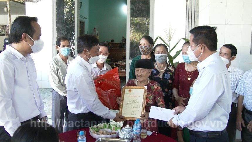 Ông Nguyễn Văn Lộc - Ủy viên Ban thường vụ Tỉnh ủy, Trưởng Ban Dân vận, Chủ tịch UBMTTQVN tỉnh Bình Dương tặng quà và thiếp mừng thọ 100 tuổi của Chủ tịch nước Nguyễn Xuân Phúc cho bà Phạm Thị Đào ở khu phố 5, thị trấn Tân Thành, huyện Bắc Tân Uyên