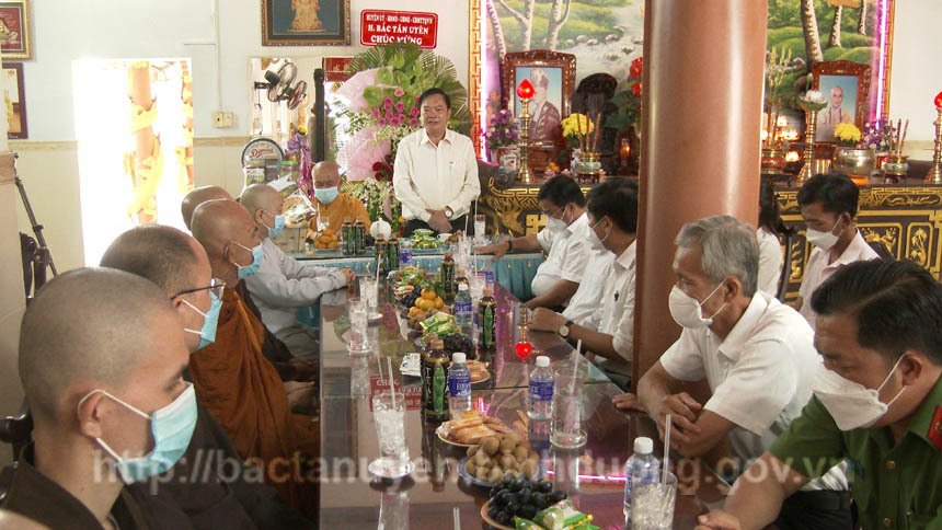 Đồng chí Phó Bí thư Thường trực Huyện ủy trân trọng gửi lời chúc sức khỏe tới Đại Đức Thích Thiện Quang - Trưởng Ban Trị sự Giáo hội Phật giáo huyện Bắc Tân Uyên và các quý chư vị chức sắc, tăng ni, Phật tử thân tâm an lạc, đạt được nhiều thành tựu trong công tác Phật sự, Đạo pháp và viên mãn trong cuộc sống. Qua đó, đồng chí đã thông tin về tình hình của huyện thời gian qua, đồng chí Phó Bí thư Huyện ủy Võ Văn Tính nhấn mạnh: Trong bối cảnh chung còn nhiều khó khăn và tình hình bệnh dịch Covid-19 diễn biến phức tạp, song các cấp, ngành, đơn vị, địa phương, cộng đồng doanh nghiệp và các tầng lớp nhân dân trên địa bàn huyện tiếp tục đoàn kết, quyết tâm, nỗ lực tổ chức thực hiện kế hoạch phát triển kinh tế - xã hội, đưa huyện nhà về trạng thái bình thường mới. Đồng thời, ghi nhận đóng góp của các tăng ni, phật tử đối với sự nghiệp xây dựng khối đại đoàn kết toàn dân tộc và phát triển KT-XH, đảm bảo an ninh - quốc phòng, an sinh xã hội tại địa phương.
