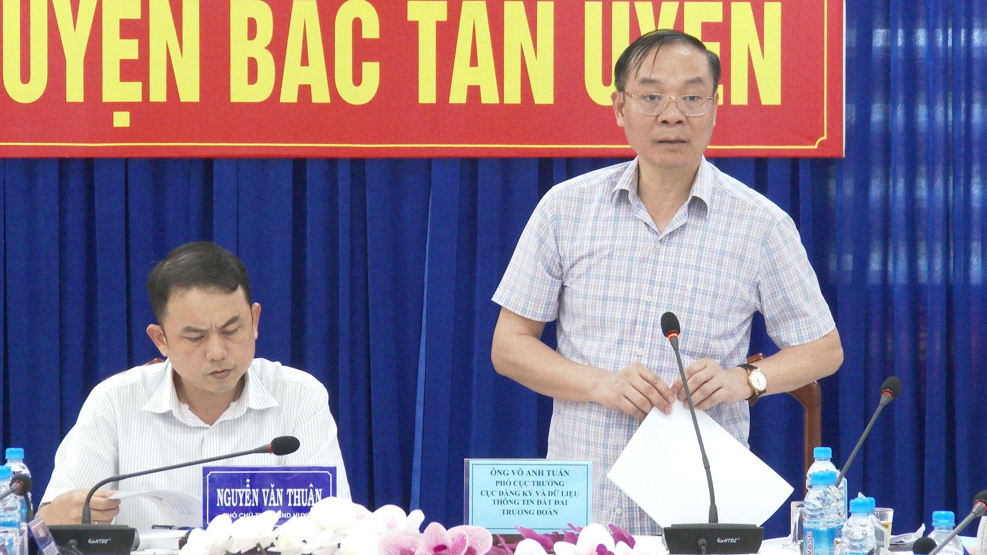Chiều ngày 3-12, đoàn Kiểm tra Cục Đăng ký và Dữ liệu thông tin đất đai (Bộ TN&MT) do ông Võ Anh Tuấn - Phó Cục trưởng làm trưởng đoàn làm việc tại huyện Bắc Tân Uyên. Tiếp và làm việc với đoàn có ông Nguyễn Văn Thuận - HUV, Phó Chủ tịch UBND huyện cùng lãnh đạo các cơ quan chuyên môn và lãnh đạo UBND, cán bộ địa chính các xã, thị trấn trong huyện.