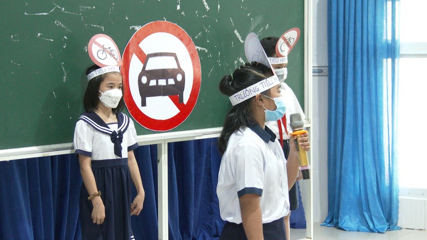 Các em học sinh đến từ các trường tiểu học tham gia ghép bảng hiệu giao thông và tiểu phẩm tuyên truyền ATGT