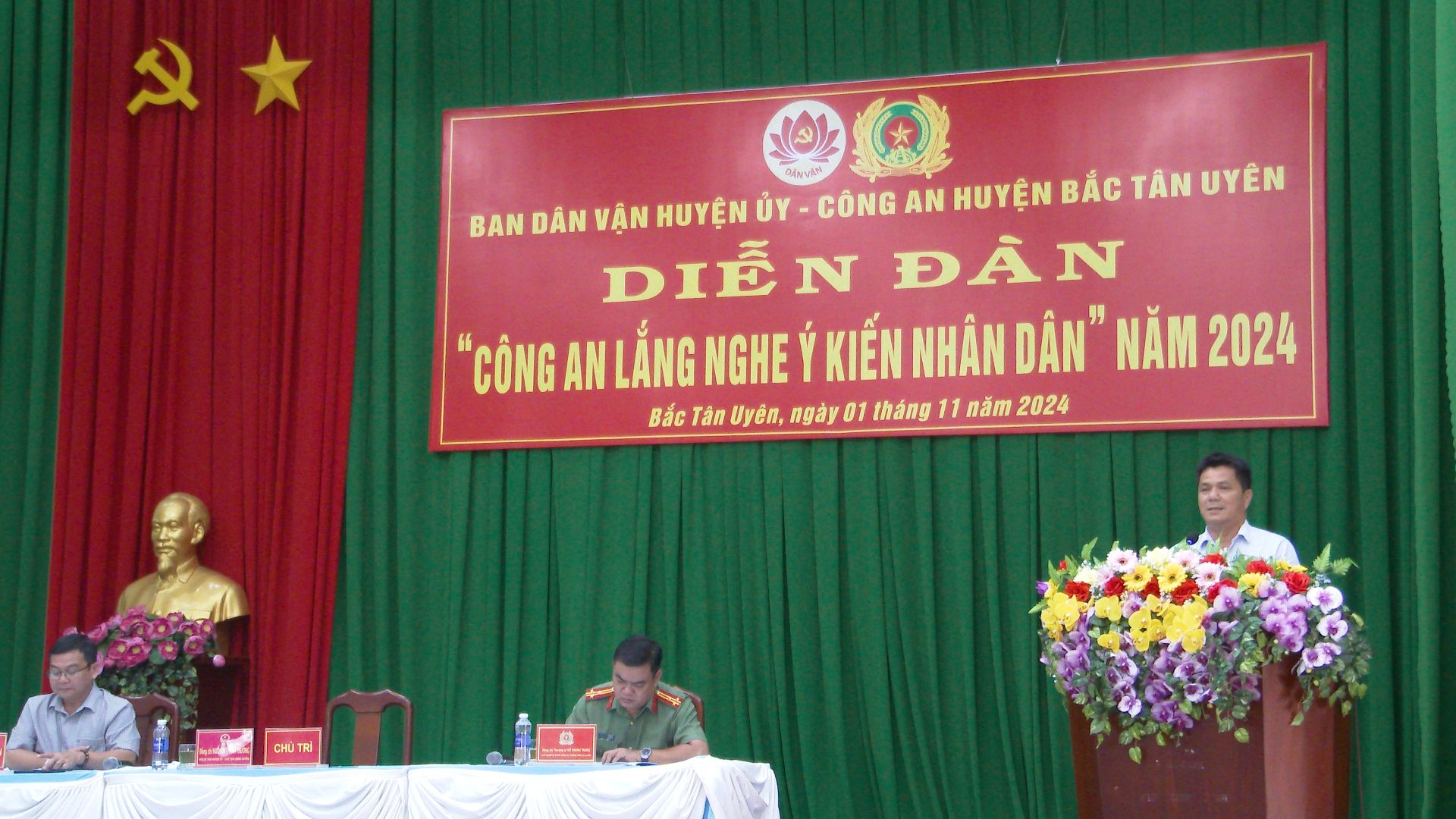 Phát biểu khai mạc tại hội nghị, ông Phạm Văn An - UVTV Huyện ủy, Trưởng Ban Dân vận Huyện ủy cho biết: Diễn đàn “Công an lắng nghe ý kiến nhân dân” là một hoạt động quan trọng, mang nhiều ý nghĩa thiết thực trong quá trình xây dựng lực lượng Công an trong sạch, vững mạnh, đáp ứng yêu cầu nhiệm vụ giữ gìn ANCT-TTATXH trong tình hình mới. Là dịp để tăng cường hơn nữa mối quan hệ gắn bó mật thiết giữa lực lượng Công an với Nhân dân; tăng cường hơn nữa mối quan hệ phối hợp, hiệp đồng chặt chẽ giữa lực lượng Công an với các cơ quan, doanh nghiệp, nhà trường và các tổ chức chính trị - xã hội ở địa phương trong công tác phòng, chống tội phạm, bài trừ tệ nạn xã hội và ngăn chặn các hành vi vi phạm pháp luật trên địa bàn. Đây cũng là dịp để mỗi lãnh đạo, chỉ huy và CB Công an huyện Bắc Tân Uyên tự nhìn nhận, tự đánh giá tình hình, kết quả thực hiện nhiệm vụ trong các mặt công tác của ngành; tự nhìn nhận, tự đánh giá về tư cách đạo đức, tác phong làm việc trong quá trình công tác cũng như trong cuộc sống; tự nhìn nhận, tự đánh giá mức độ tận tụy vì nhân dân phục vụ.