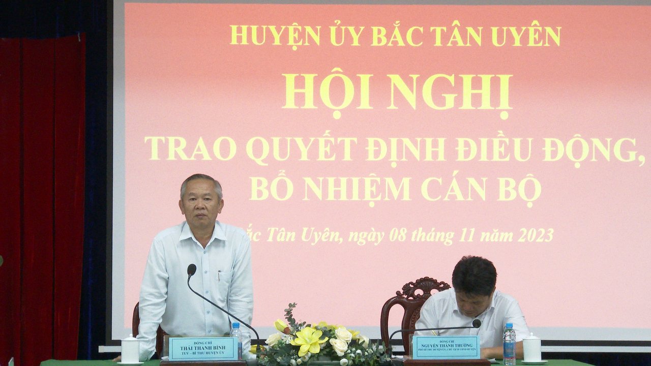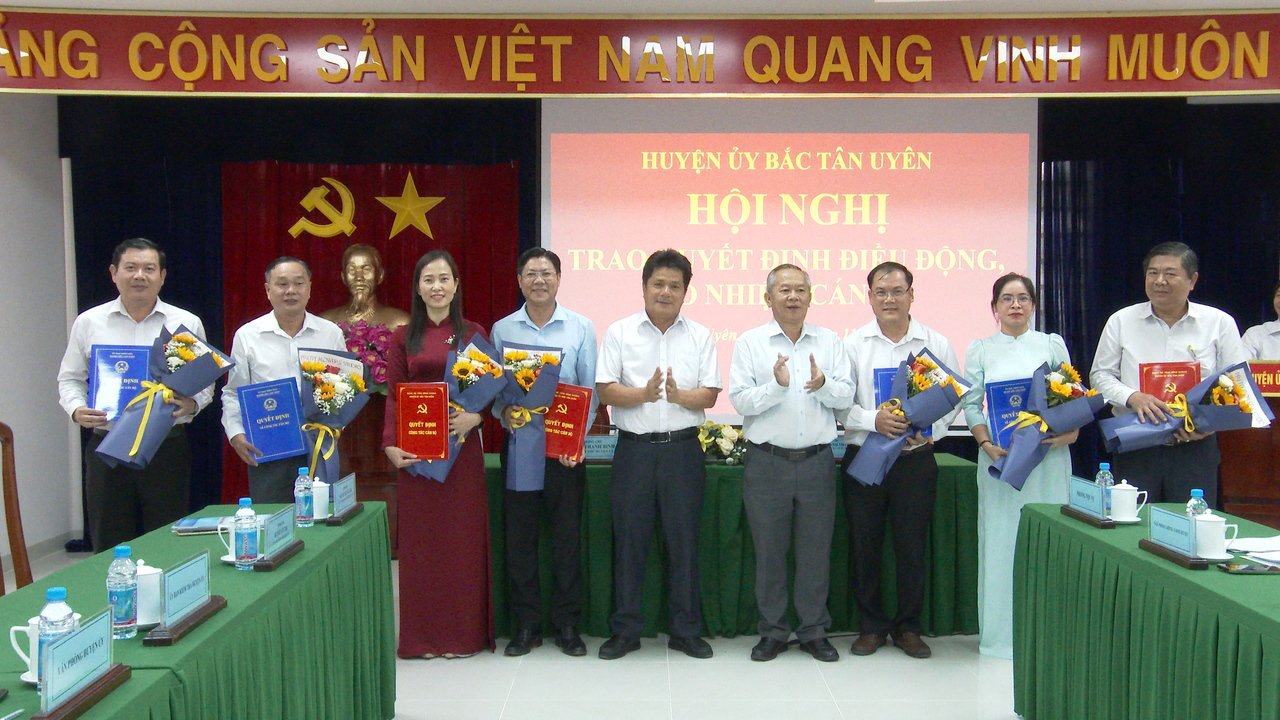 Hội nghị đã công bố các quyết định của Ban tổ chức Tỉnh ủy, Huyện ủy, UBND huyện về điều động, bổ nhiệm cán bộ. Theo đó, Ban tổ chức Tỉnh ủy điều động đồng chí Nguyễn Thành Tâm-Huyện ủy viên-Trưởng phòng Tài chính-Kế hoạch huyện đến nhận công tác tại Ủy ban Kiểm tra Huyện ủy Bắc Tân Uyên kề từ tháng 11 năm 2023. Huyện ủy chỉ định đồng chí Nguyễn Hùng Sơn-Huyện ủy viên-Chánh văn phòng HĐND-UBND huyện tham gia vào Ban chấp hành, Ban Thường vụ Đảng ủy và giữ chức vụ Bí thư Đảng ủy xã Đất Cuốc, nhiệm kỳ 2020-2025, kể từ tháng 11 năm 2023; chỉ định đồng chí Trần Hoài Thu-huyện ủy viên-Phó Chủ nhiệm Ủy ban Kiểm tra Huyện ủy tham gia vào Ban chấp hành, Ban Thường vụ Đảng ủy và giữ chức vụ Bí thư Đảng ủy thị trấn Tân Thành, nhiệm kỳ 2020-2025, kể từ tháng 11 năm 2023. UBND huyện điều động và bổ nhiệm đồng chí Nguyễn Anh Thắm-Phó Chánh thanh tra huyện đến nhận công tác tại Văn phòng HĐND-UBND huyện và giữ chức vụ Chánh Văn phòng HĐND-UBND huyện, thời gian bổ nhiệm là 5 năm; điều động và bổ nhiệm đồng chí Phạm Thị Bích Diên-Phó Bí thư Đảng ủy xã Tân Lập đến nhận công tác tại phòng Tư pháp, giữ chức vụ Phó Trưởng phòng Tư pháp huyện, thời gian bổ nhiệm là 5 năm; điều động và bổ nhiệm đồng chí Phạm Ngọc Uy-Bí thư Đảng ủy xã Đất Cuốc đến nhận công tác tại phòng Tài chính-Kế hoạch huyện, giữ chức vụ Trưởng phòng Tài chính-Kế hoạch huyện, thời gian bổ nhiệm là 5 năm; điều động và bổ nhiệm đồng chí Huỳnh Thanh Tuấn-Bí thư Đảng ủy thị trấn Tân Thành đến nhận công tác tại Thanh tra huyện, giữ chức vụ Chánh Thanh tra huyện, thời gian bổ nhiệm là 5 năm.