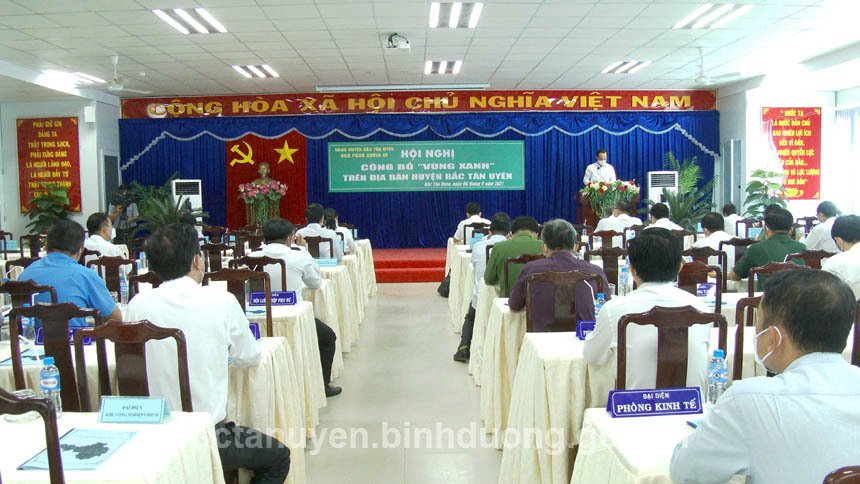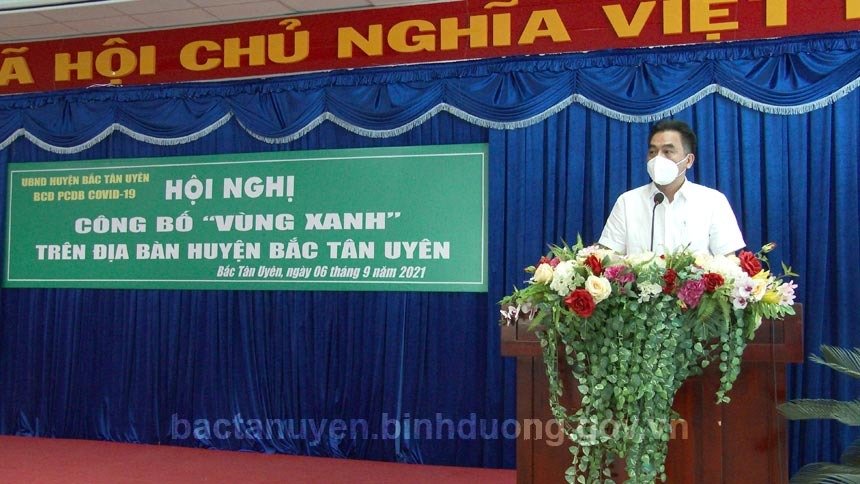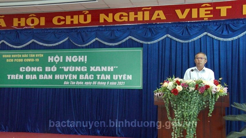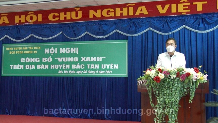 Sáng ngày 6-9, UBND huyện Bắc Tân Uyên, Ban Chỉ đạo phòng, chống dịch bệnh Covid-19 huyện tổ chức Hội nghị công bố “vùng xanh” trên địa bàn huyện. Đến dự hội nghị, có ông Nguyễn Lộc Hà - Ủy viên Ban Thường vụ, Phó Chủ tịch UBND tỉnh; Thạc sỹ Dương Chí Nam - Phó Cục trưởng Cục Quản lý môi trường Y tế-Bộ Y tế; các thành viên Tổ công tác “vùng xanh” của Tỉnh; ông Thái Thanh Bình - Bí thư Huyện ủy, Chủ tịch UBND huyện, Trưởng Ban Chỉ đạo phòng, chống dịch bệnh Covid-19 huyện; ông Võ Văn Tính - Phó Bí thư Thường trực Huyện ủy, Chủ tịch HĐND huyện; các ông bà Ủy viên Ban Thường vụ Huyện ủy, thành viên Ban Chỉ đạo phòng, chống dịch bệnh Covid-19 huyện cùng lãnh đạo các xã, thị trấn trên địa bàn huyện.