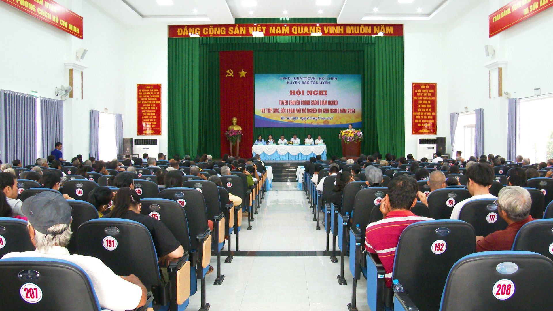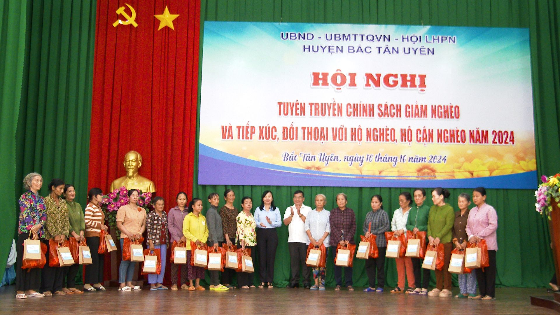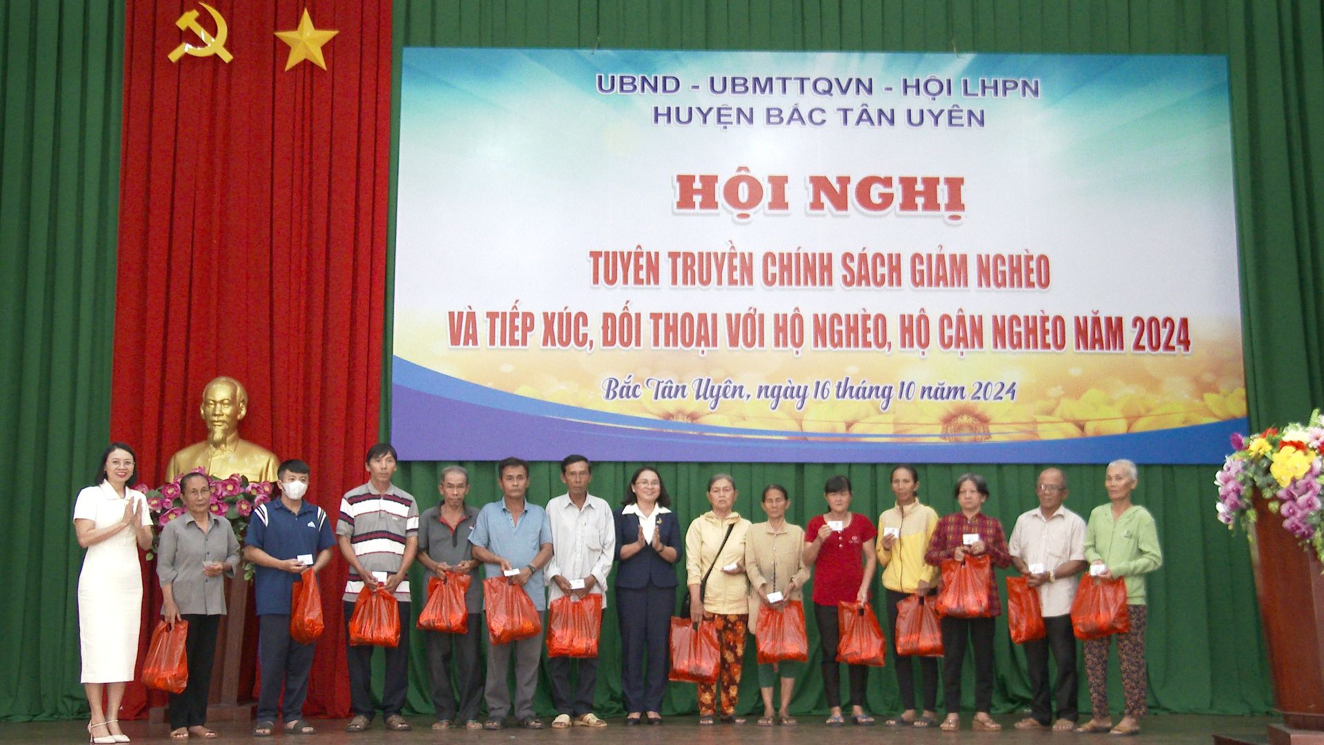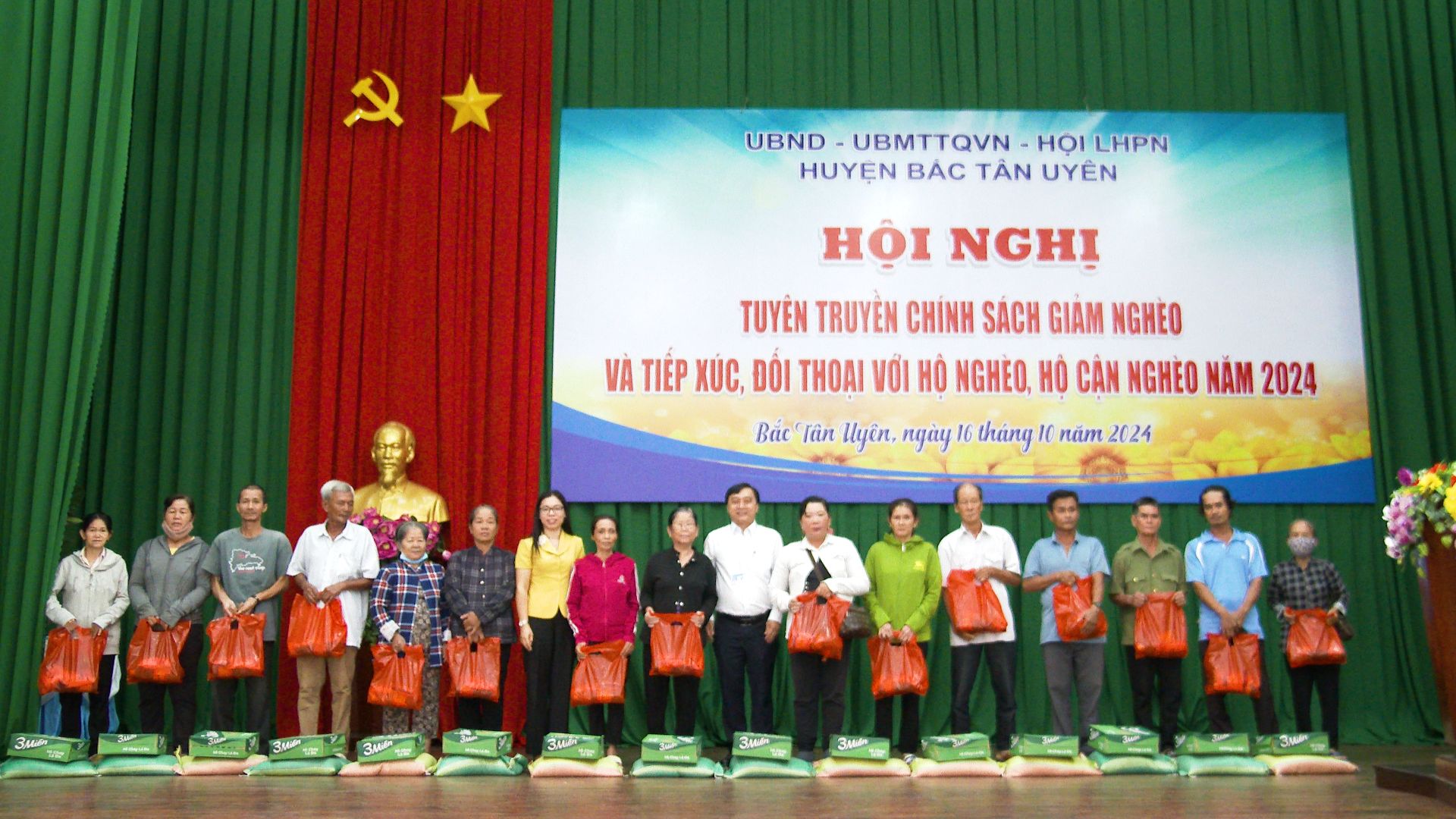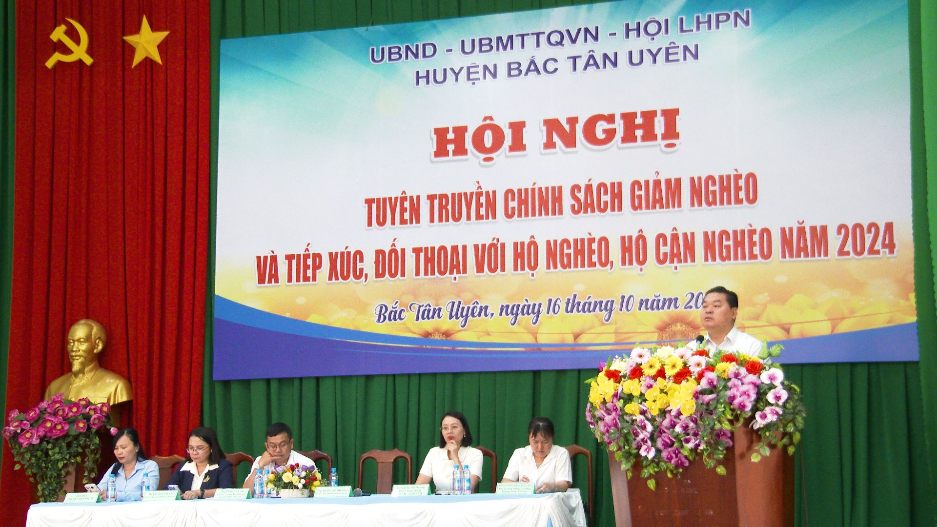 Sáng ngày 16-10, Huyện Bắc Tân Uyên tổ chức hội nghị tuyên truyền chính sách giảm nghèo và tiếp xúc, đối thoại với hộ nghèo, hộ cận nghèo năm 2024. Tham dự hội nghị có bà Nguyễn Thị Phương - Phó Trưởng phòng Bảo trợ Xã hội - Sở LĐTBXH tỉnh; ông Trần Văn Phương - UVTV Huyện ủy, Phó Chủ tịch UBND huyện, Trưởng Ban chỉ đạo chương trình mục tiêu quốc gia giảm nghèo huyện; ông Phạm Văn An - UVTV Huyện ủy, Trưởng Ban Dân vận Huyện ủy; bà Lê Huỳnh Lê - HUV, Chủ tịch UB MTTQ huyện; đại diện lãnh đạo các cơ quan, ban, ngành, đoàn thể huyện cùng đại diện lãnh đạo UBND, cán bộ phụ trách công tác giảm nghèo các xã, thị trấn và 225 hộ nghèo, hộ cận nghèo trong toàn huyện.