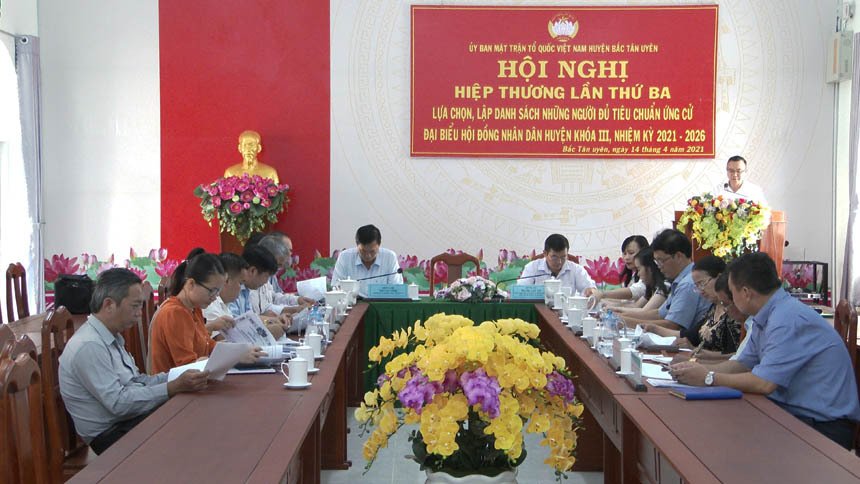 Sáng 14-4, Thường trực UBMTTQ VN huyện Bắc Tân Uyên đã tổ chức Hội nghị Hiệp thương lần thứ ba lựa chọn, lập danh sách những người đủ tiêu chuẩn ứng cử Đại biểu HĐND huyện, nhiệm kỳ 2021 – 2026. Dự Hội nghị có ông Võ Văn Tính – Phó Bí thư Thường trực Huyện ủy; ông Phạm Văn An - UVTV Huyện ủy, Trưởng Ban Dân vận, Chủ tịch UBMTTQVN huyện, lãnh đạo các tổ chức thành viên của MTTQ huyện.