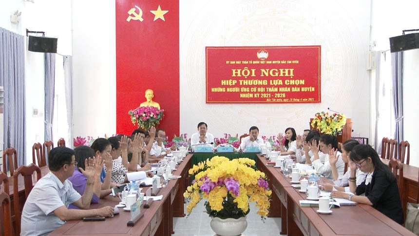 Tại Hội nghị, Tòa án nhân dân huyện Bắc Tân Uyên đã thông qua tờ trình, danh sách dự kiến những người ứng cử Hội thẩm nhân dân huyện Bắc Tân Uyên, nhiệm kỳ 2021-2026 để hội nghị cho ý kiến, biểu quyết. Sau khi thảo luận, Hội nghị đã thống nhất biểu quyết danh sách người ứng cử Hội thẩm nhân dân huyện nhiệm kỳ 2021-2026 gồm 21 người gồm các xã, thị trấn 11 người và cán bộ đương chức tại các cơ quan, ban ngành, đoàn thể huyện, cán bộ hưu trí 10 người.