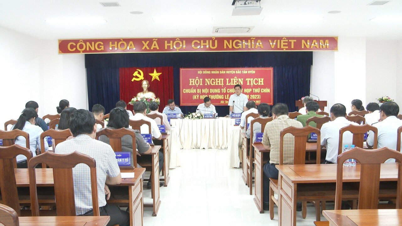 Chiều ngày 24/10, huyện Bắc Tân Uyên tổ chức hội nghị liên tịch chuẩn bị nội dung tổ chức kỳ họp thứ 9 HĐND huyện (kỳ họp thường lệ cuối năm 2023). Chủ trì hội nghị có ông Võ Văn Tính-PBT TT Huyện ủy-Chủ tịch HĐND huyện, ông Nguyễn Thành Thường-PBT Huyện ủy-Chủ tịch UBND huyện, ông Phạm Văn An-UVTV-Trưởng ban Dân vận-Chủ tịch Ủy ban MTTQ VN huyện; cùng dự hội nghị có ông Lê Văn Quý-UVTV-Phó Chủ tịch HĐND huyện, Trưởng 2 ban HĐND huyện, lãnh đạo các cơ quan, ban, ngành huyện.