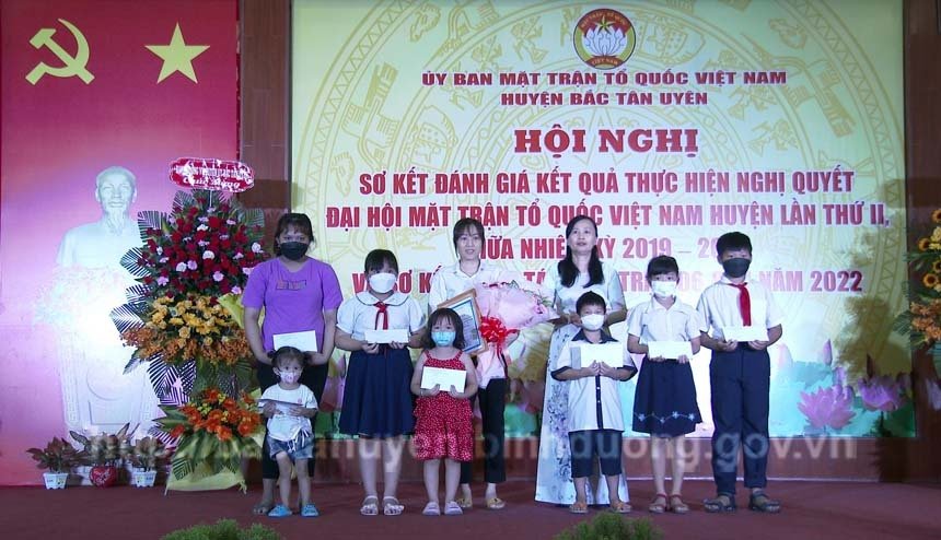 Dịp này, UBND huyện đã tặng giấy khen cho 9 tập thể và 17 cá nhân có những đóng góp quan trọng trong thực hiện công tác Mặt trận trong giữa nhiệm kỳ 2019 – 2024. Công ty Cổ phần đá Hoa Tân An, xã Thường Tân ủng hộ Quỹ vì người nghèo huyện với số tiền 70 triệu đồng; bà Ngô Thị Kiều Diễm – khu phố 4, thị trấn Tân Thành trao tặng 7 xuất học bổng cho 7 trẻ mồ côi cha, mẹ trên địa bàn huyện do đại dịch Covid-19 gây ra, mỗi xuất 1 triệu đồng.
