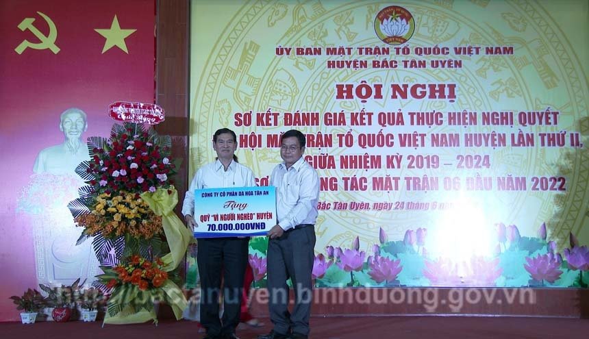 Sáng ngày 24-6 , Ủy ban Mặt trận Tổ quốc Việt Nam huyện Bắc Tân Uyên tổ chức Hội nghị Sơ kết đánh giá kết quả thực hiện Nghị quyết Đại hội MTTQVN huyện lần thứ II, giữa nhiệm kỳ 2019 – 2024 và Sơ kết công tác Mặt trận 6 tháng đầu năm 2022. Đến dự Hội nghị có ông Nguyễn Huỳnh Đình – Phó Chủ tịch Ủy ban MTTQVN tỉnh Bình Dương; ông Võ Văn Tính – Phó Bí thư Thường trực Huyện ủy, Chủ tịch HĐND huyện; ông Lê Văn Quý – Phó Chủ tịch HĐND huyện; ông Phạm Văn An – Trưởng Ban Dân vận Huyện ủy, Chủ tịch Ủy ban MTTQVN huyện Chủ trì hội nghị. Cùng các ông, bà trong Ban thường trực, thành viên Ủy ban MTTQVN huyện khóa II, nhiệm kỳ 2019 – 2024 và các ông, bà trong Ban thường trực Ủy ban MTTQVN các xã, thị trấn về dự Hội nghị.