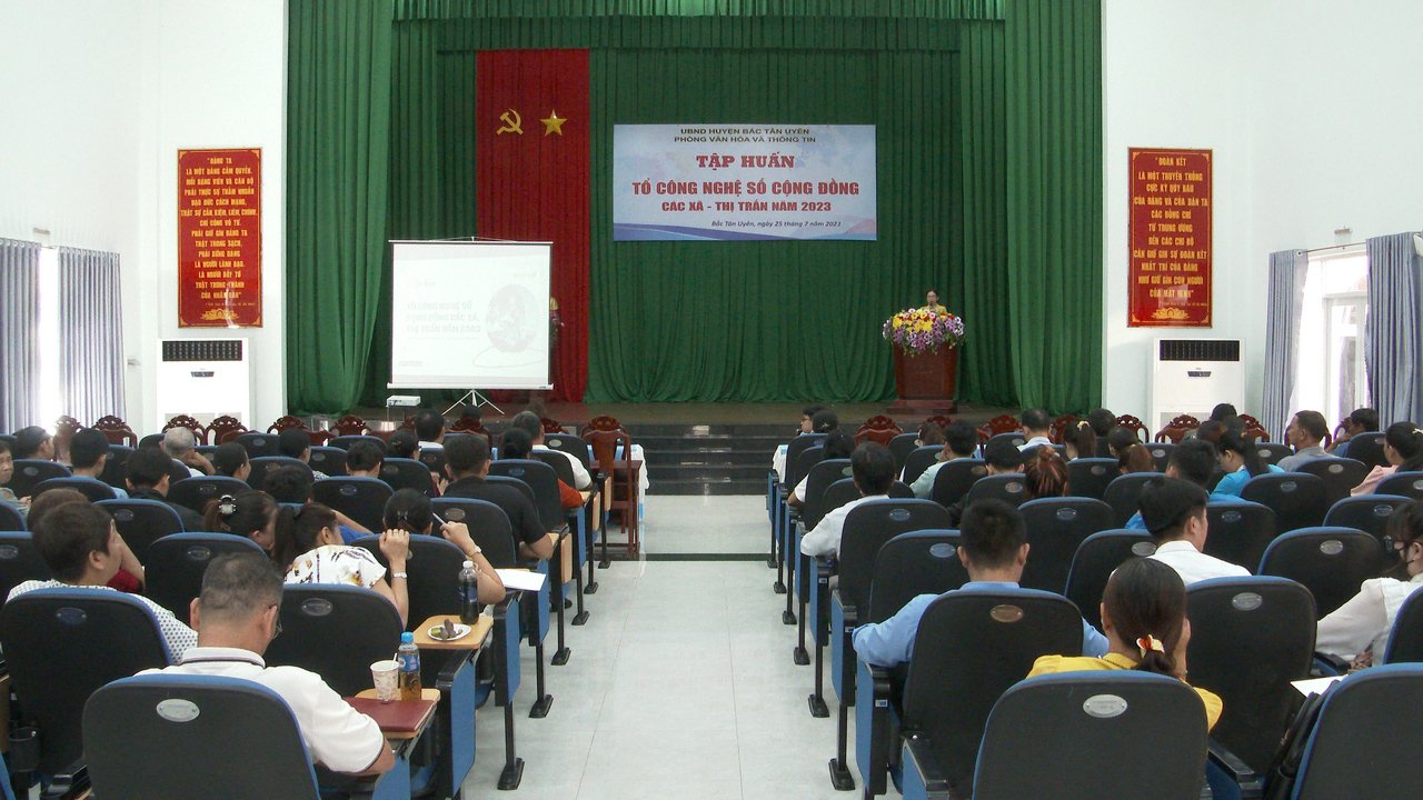 Toàn cSáng ngày 25/7, Phòng Văn hóa và Thông tin huyện Bắc Tân Uyên tổ chức Hội nghị tập huấn tổ công nghệ số Cộng đồng cho các xã, thị trấn năm 2023. Tham dự hội nghị có bà Nguyễn Thị An Kim - HUV - Trưởng Phòng VH&TT huyện; bà Lê Thủy Trúc – Trưởng phòng phát triển - ứng dụng AI Công ty CPTM Điện Tử Aloha - giảng viên hội nghị, cùng sự có mặt của hơn 300 cán bộ, công chức, viên chức, thành viên của các tổ công nghệ số cộng đồng 10 xã, thị trấn trên địa bàn huyện.