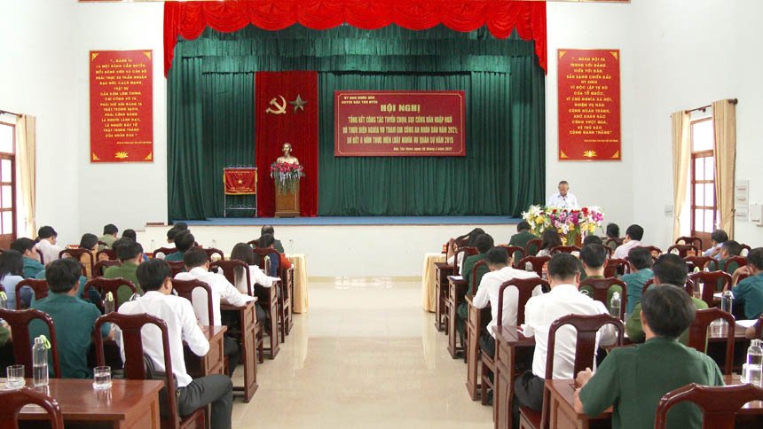 Trong năm 2021, toàn huyện đã giao quân hoàn thành 100% chỉ tiêu ở cả 2 cấp với 116 công dân đủ điều kiện nhập ngũ, trong đó nhập ngũ vào quân đội nhân dân là 99 công dân và tham gia vào công an nhân dân là 17 công dân. Số lượng đảng viên chính thức nhập ngũ đạt 4,5%, công dân có trình độ trung cấp, cao đẳng, đại học đạt 29,3%; đã tổ chức tuyên truyền luật NVQS và các văn bản có liên quan trên loa đài truyền thanh được 1.452 giờ...
