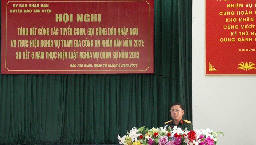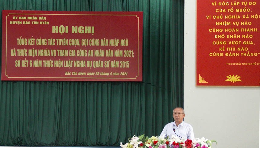 Ngày 26-4, tại hội trường Ban Chỉ huy Quân sự huyện, UBND huyện Bắc Tân Uyên tổ chức Hội nghị tổng kết công tác tuyển chọn, gọi công dân nhập ngũ năm 2021 và sơ kết 6 năm thực hiện Luật nghĩa vụ quân sự năm 2015, phương hướng nhiệm vụ trọng tâm trong thời gian tới.