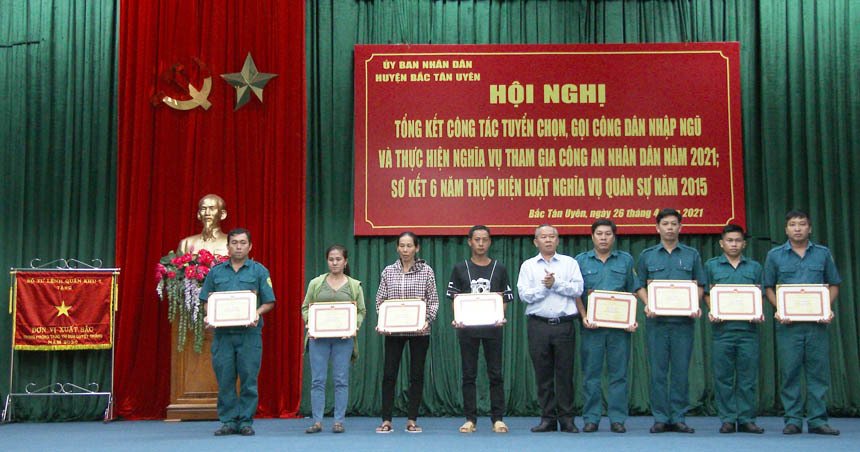 Cũng tại hội nghị, đại diện lãnh đạo UBND huyện Bắc Tân Uyên đã trao 62 giấy khen cho các cá nhân, hộ gia đình, tập thể tiêu biểu trong công tác tuyển chọn và gọi quân nhân nhập ngũ năm 2021.