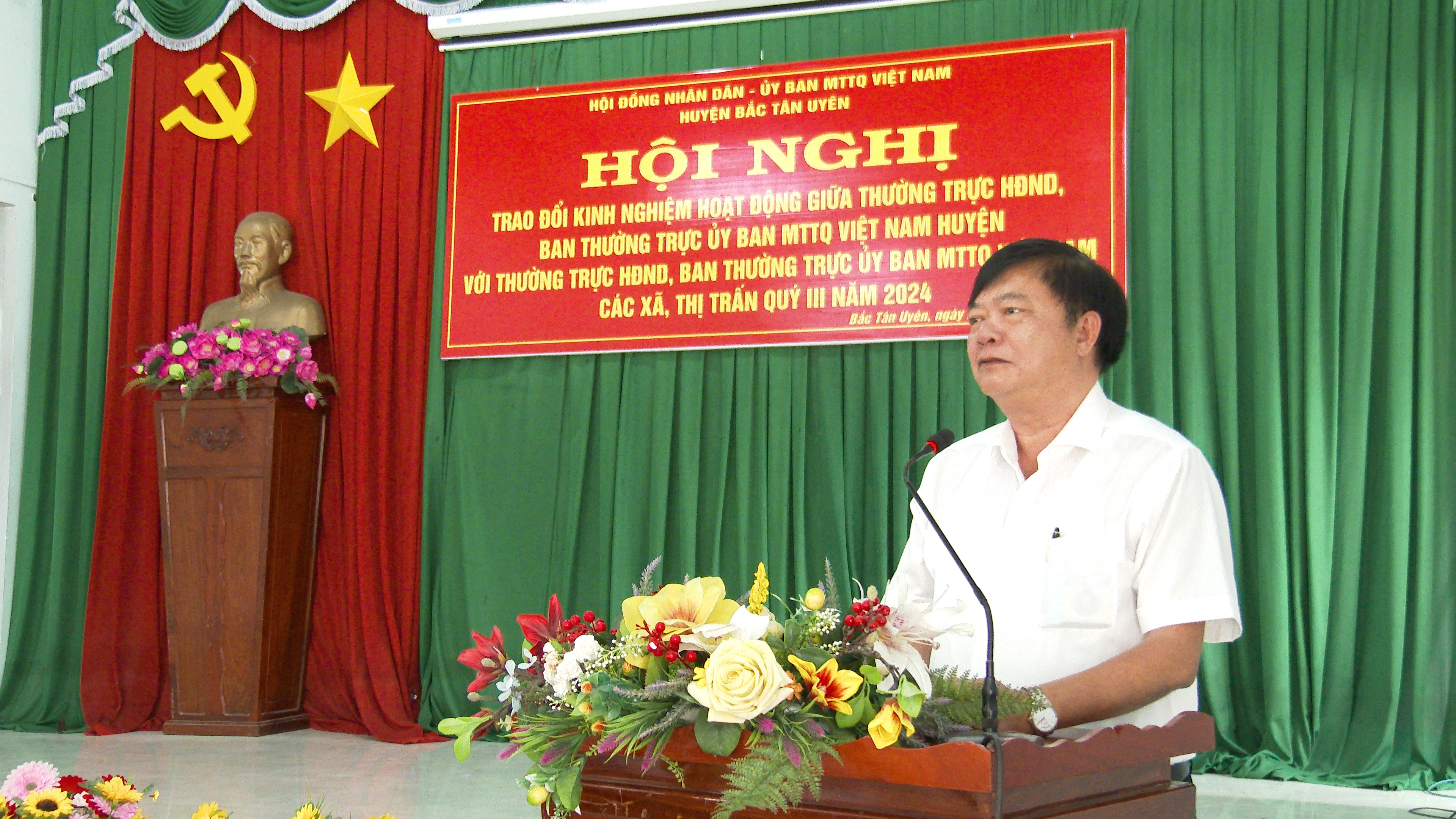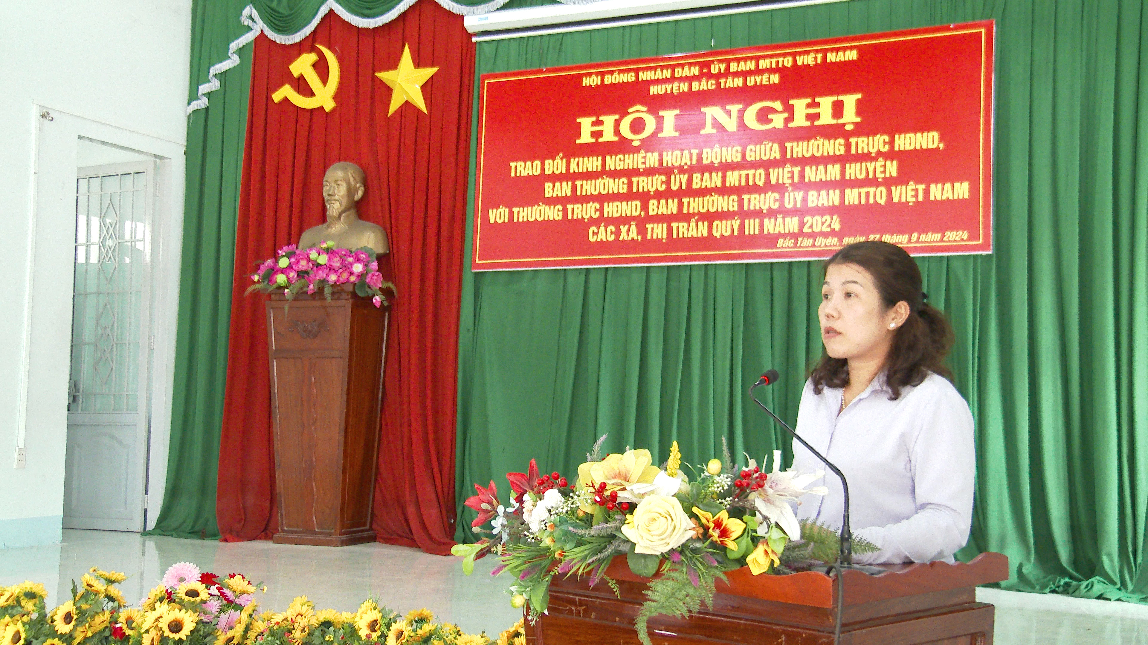 Thường trực HĐND huyện Bắc Tân Uyên phối hợp UBMTTQ Việt Nam huyện vừa tổ chức Hội nghị Trao đổi kinh nghiệm hoạt động giữa Thường trực HĐND, UBMTTQ huyện với Thường trực HĐND, UBMTTQ xã, thị trấn với nội dung: “Thực trạng, kinh nghiệm, giải pháp nâng cao chất lượng tổ chức Hội nghị TXCT của Đại biểu HĐND trước và sau các kỳ họp HĐND các cấp”. Tham dự hội nghị có ông Võ Văn Tính - Phó Bí thư Thường trực Huyện ủy, Chủ tịch HĐND huyện; Bà Võ Thị Tuyết Nhung - HUV, Phó Chủ tịch UBMTTQ VN huyện; đại diện các Ban HĐND huyện và Thường trực HĐND, lãnh đạo các Ban HĐND, Ủy ban MTTQ các xã, thị trấn trên địa bàn huyện.