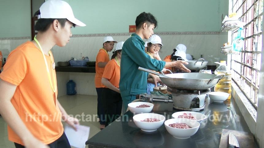 Hội trại hè năm nay, các em học sinh được tham quan, trải nghiệm nhiều hoạt động. Trong ảnh là tham quan bếp ăn quân đội