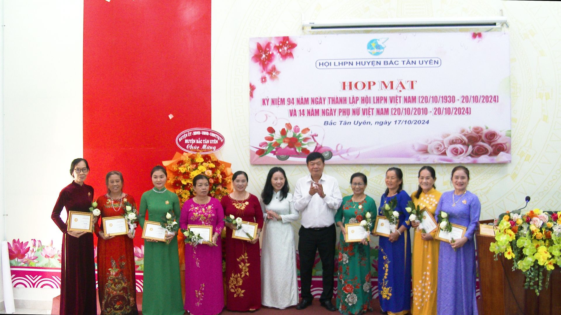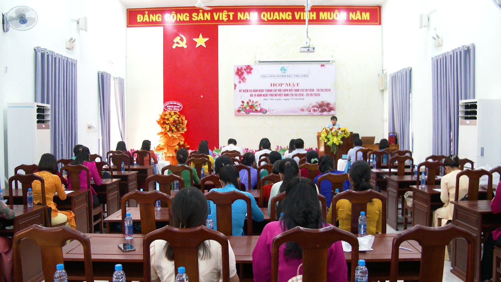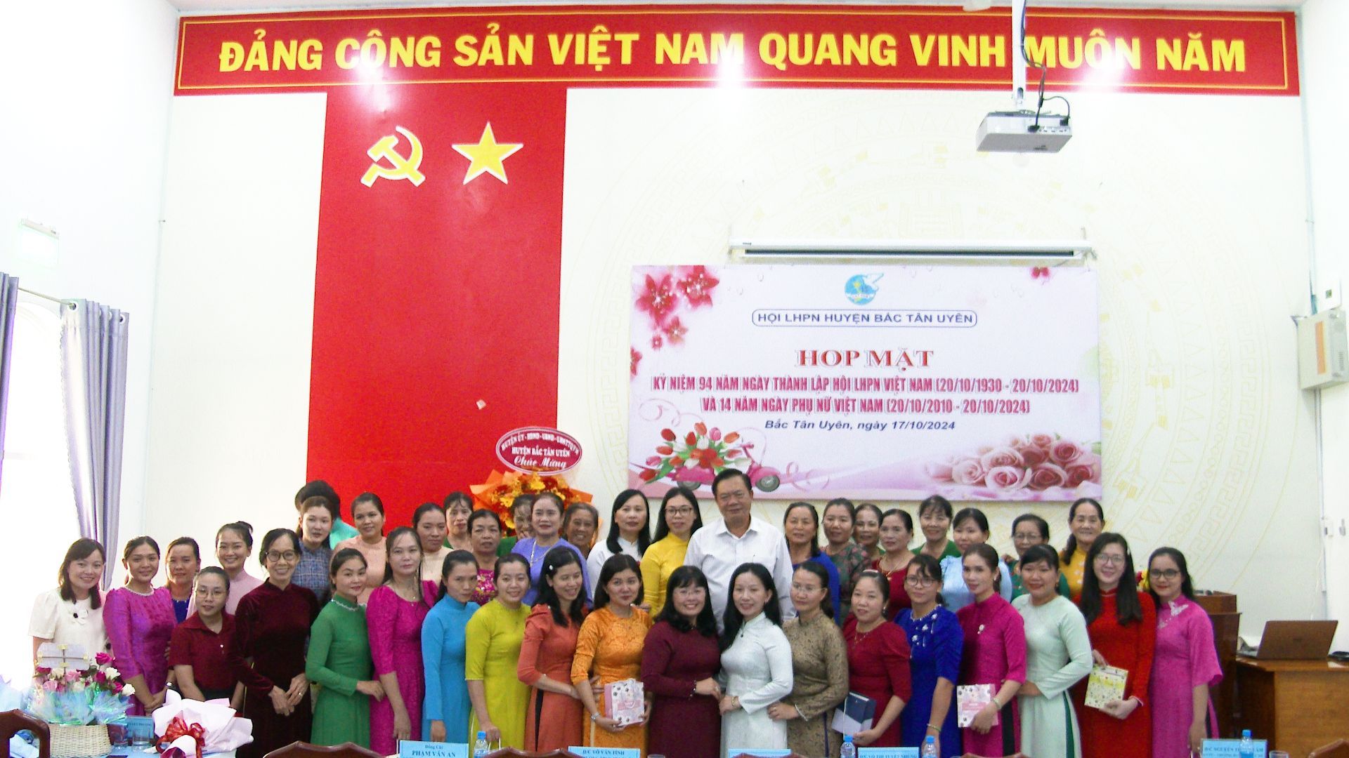 Sáng ngày 17-10, Hội LHPN huyện Bắc Tân Uyên tổ chức Họp mặt kỷ niệm 94 năm Ngày thành lập Hội Liên hiệp Phụ nữ Việt Nam và kỷ niệm 14 năm Ngày Phụ nữ Việt Nam. Tham dự hội nghị có bà Huỳnh Thị Thúy Phương - Phó Chủ tịch Thường trực hội LHPN tỉnh; ông Võ Văn Tính - Phó Bí thư Thường trực Huyện ủy, Chủ tịch HĐND huyện; ông Phạm Văn An - UVTV Huyện ủy, Trưởng Ban Dân vận Huyện ủy; ông Nguyễn Thanh Lâm - UVTV Huyện ủy, Trưởng Ban Tổ chức Huyện ủy; bà Lê Huỳnh Lê - UVTV Huyện ủy, Chủ tịch UBMTTQVN huyện; bà Võ Thị Tuyết Nhung - HUV, Chủ tịch hội LHPN Huyện; cùng đại diện lãnh đạo các cơ quan, ban, ngành, đoàn thể huyện; chủ tịch, phó chủ tịch hội LHPN các xã, thị trấn và các hội viên được nhận kỷ niệm chương vì sự phát triển của phụ nữ.