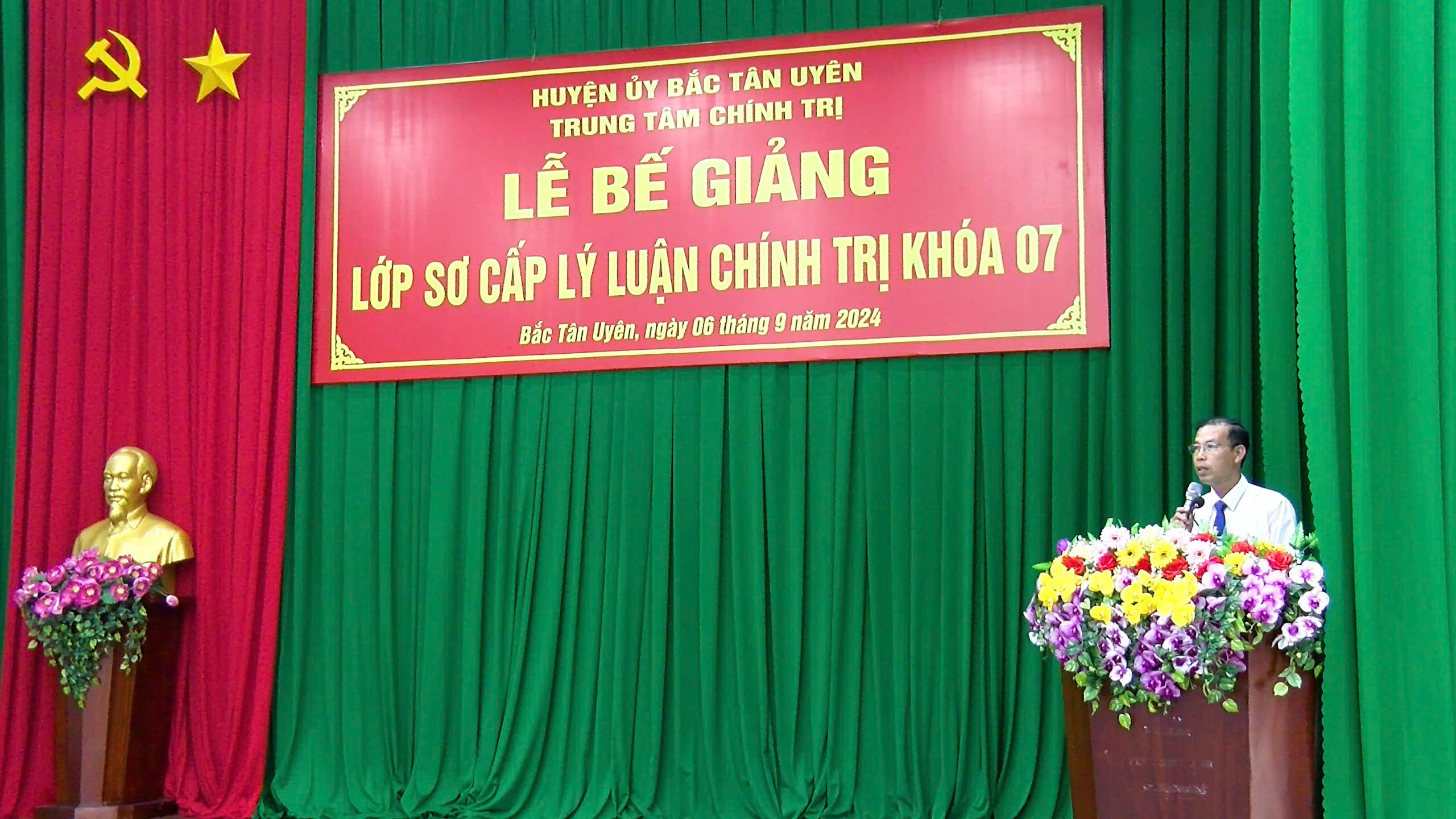 Sáng ngày 6/9, Trung tâm Chính trị huyện Bắc Tân Uyên tổ chức Lễ bế giảng lớp Sơ cấp lý luận chính trị khóa 7, năm 2024. Tham dự buổi lễ bế giảng có Đ/c Lưu Hữu Duyên - UVTV Huyện ủy, Trưởng Ban Tuyên giáo huyện ủy, Giám Đốc Trung tâm Chính trị huyện; Đ/c Nguyễn Trọng Bình - HUV, Chánh văn phòng Huyện ủy; Đ/c Nguyễn Tấn Anh - HUV, Trưởng phòng GDĐT huyện cùng tập thể ban cán sự và học viên lớp Sơ cấp Lý luận Chính trị khóa 7.
