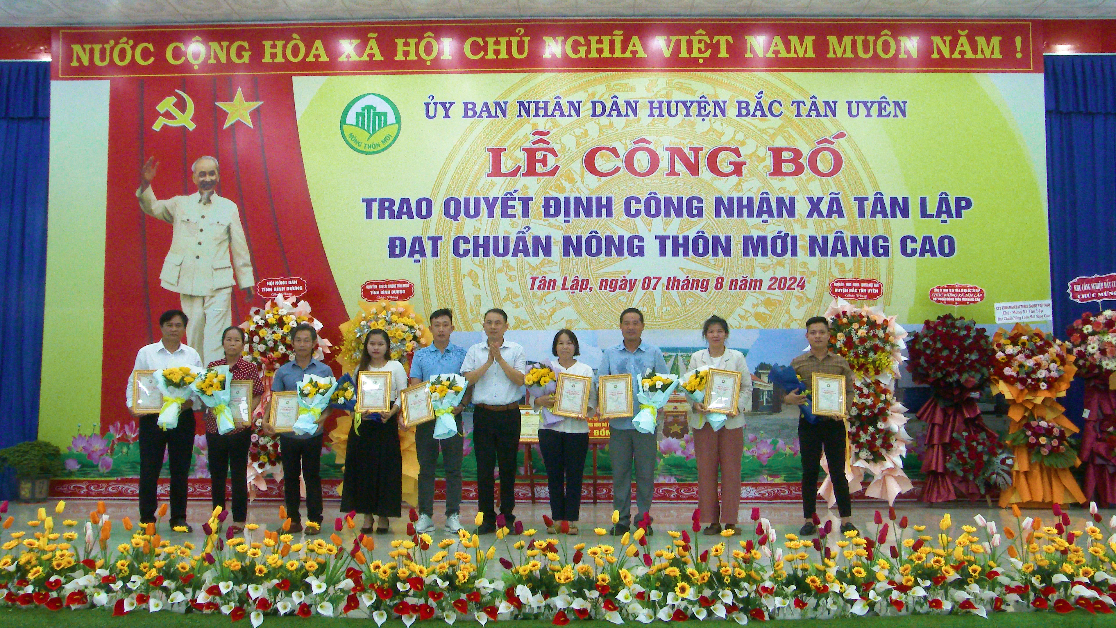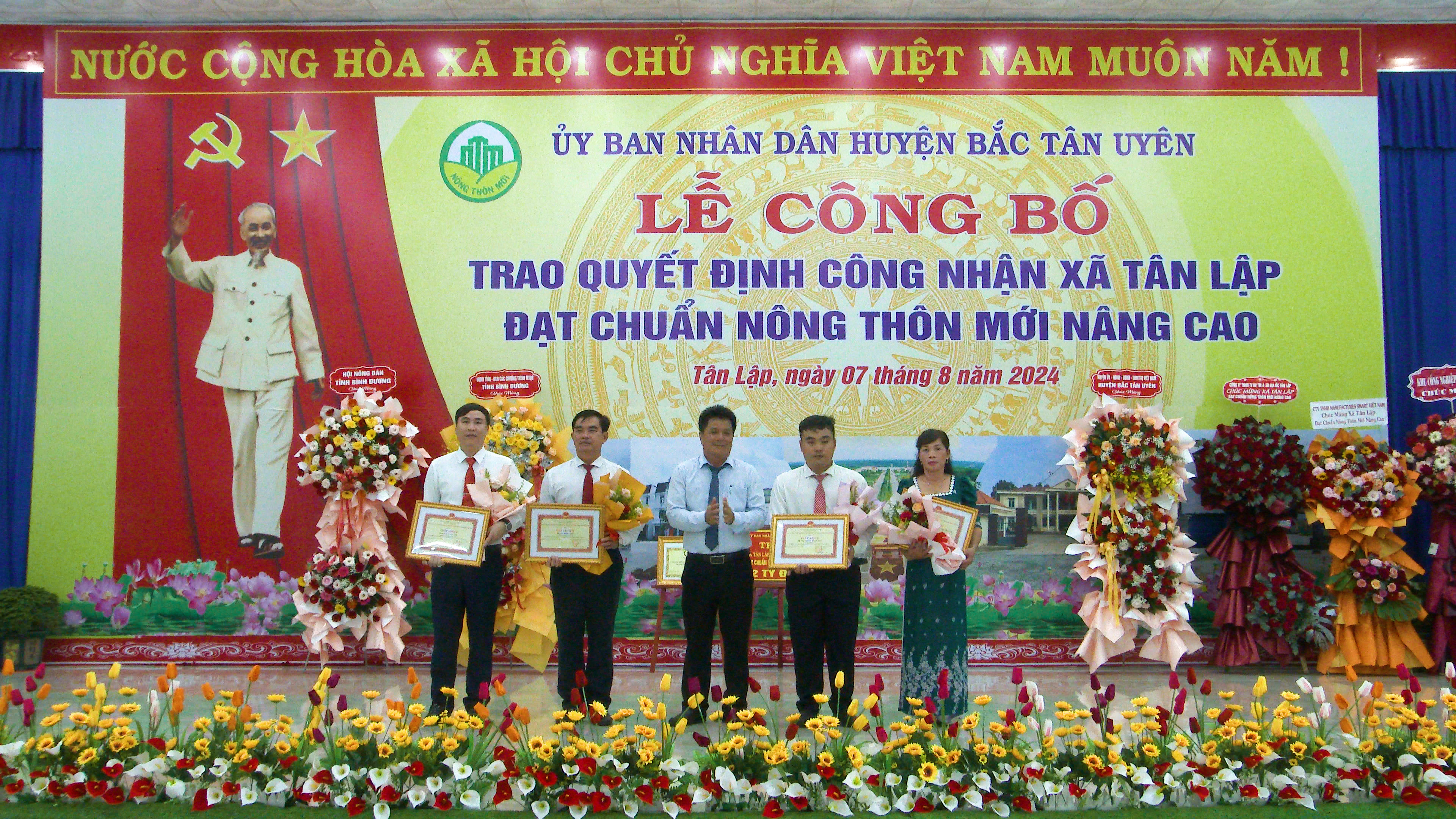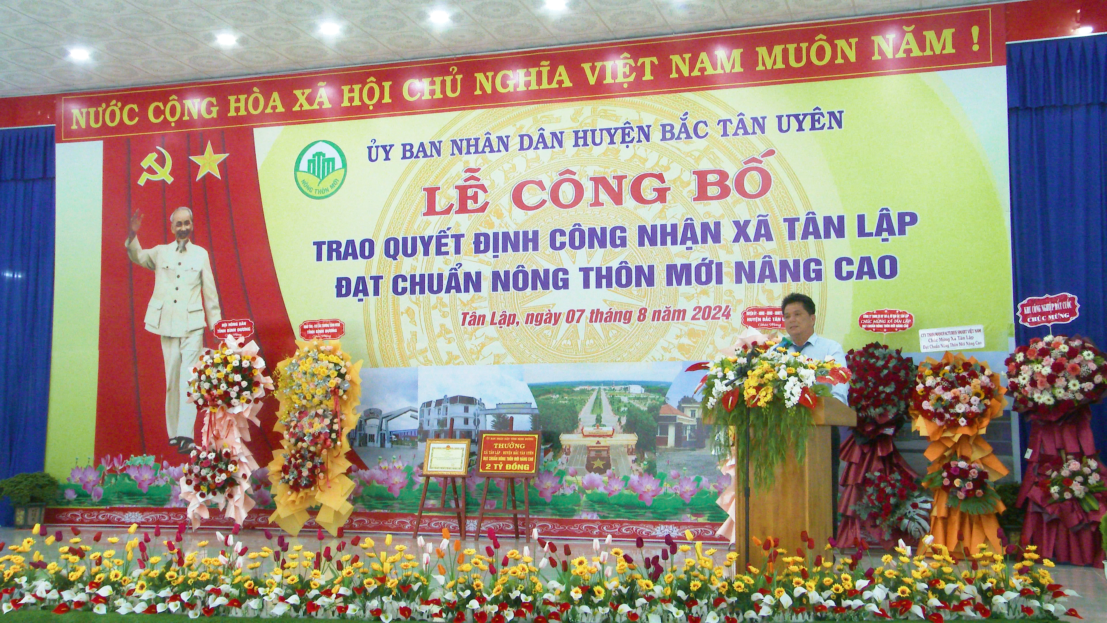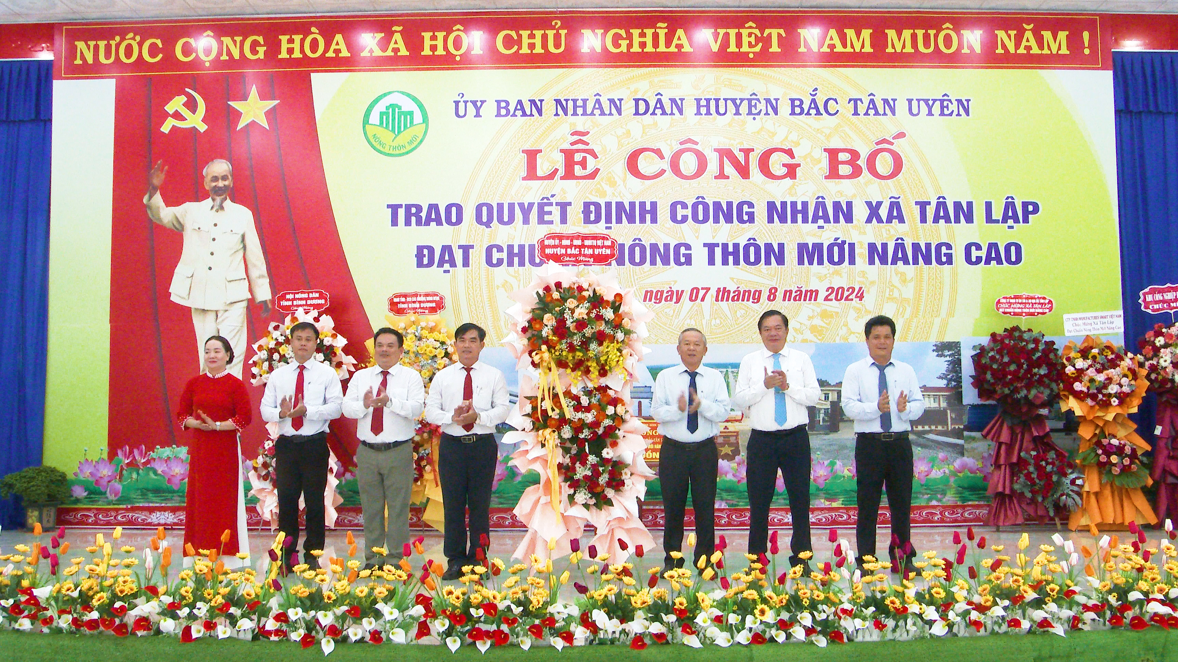 Chiều ngày 7-8, Uỷ ban nhân dân huyện Bắc Tân Uyên long trọng tổ chức lễ công bố và đón nhận Quyết định của Chủ tịch UBND tỉnh Bình Dương, công nhận xã Tân Lập đạt chuẩn nông thôn mới (NTM) nâng cao năm 2023. Tham dự lễ có ông Hồ Trúc Thanh- Phó giám đốc sở nông nghiệp và phát triển nông thôn tỉnh; bà Trần Thị Kim Lan- Phó Chủ tịch UB MTTQ VN tỉnh cùng lãnh đạo các ban, ngành của tỉnh. Về Phía Huyện có ông Thái Thanh Bình- TUV, Bí thư Huyện ủy; ông Võ Văn Tính- Phó Bí thư Thường trực Huyện ủy, Chủ tịch HĐND huyện; ông Nguyễn Thành Thường- Phó Bí thư Huyện ủy, Chủ tịch UBND huyện cùng các Ủy viên ban Thường vụ Huyện ủy; lãnh đạo các ban, ngành, đoàn thể huyện, lãnh đạo các xã, thị trấn; lãnh đạo UBND xã và Ban điều hành, ban công tác mặt trận, các doanh nghiệp, hợp tác xã trên địa bàn xã Tân Lập.