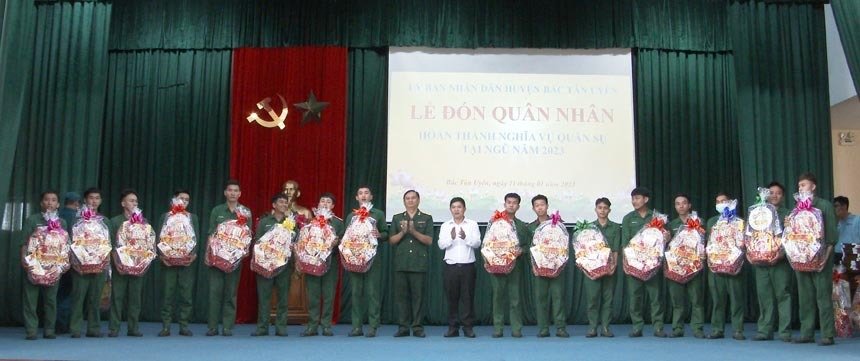 Sáng 11-1, UBND huyện Bắc Tân Uyên tổ chức Lễ đón quân nhân xuất ngũ hoàn thành nghĩa vụ quân sự trở về địa phương năm 2023. Tham dự buổi lễ có Thượng tá Vũ Quốc Dương - Phó Chủ nhiệm Kỹ thuật, Bộ CHQS tỉnh; Trung tá Lê Đông Dương - Phó Chỉ huy trưởng Ban CHQS huyện; ông Đỗ Ngọc Lợi - Bí thư Huyện đoàn.