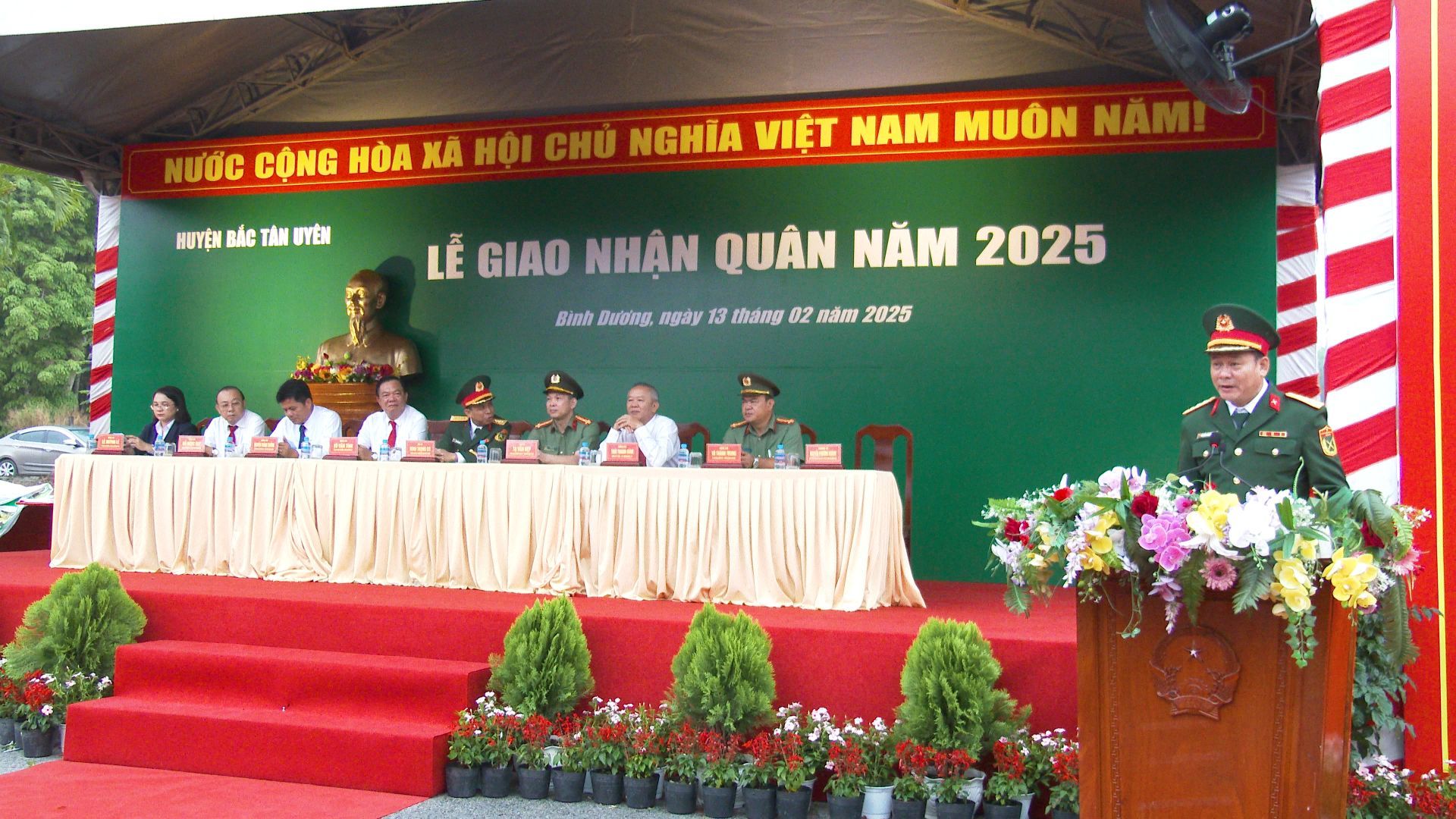 Tại buổi lễ, thay mặt Hội đồng nghĩa vụ quân sự huyện, Thượng tá Nguyễn Phương Khánh-Ủy viên Thường vụ Huyện ủy-Chỉ huy trưởng-Ban Chỉ huy quân sự huyện đã công bố Quyết định của UBND tỉnh, Bộ Chỉ huy quân sự tỉnh và Công an tỉnh về chỉ tiêu giao nhận quân của huyện Bắc Tân Uyên năm 2025. Năm nay, huyện Bắc Tân Uyên có 135 tân binh được giao về các đơn vị gồm Công an tỉnh Bình Dương, Bộ Chỉ huy quân sự tỉnh Bình Dương, tiểu đoàn 15, sư đoàn 5; lữ đoàn đặc công 429, Binh chủng đặc công. Trong đó có 7 đảng viên trẻ, 100% tân binh là đoàn viên.