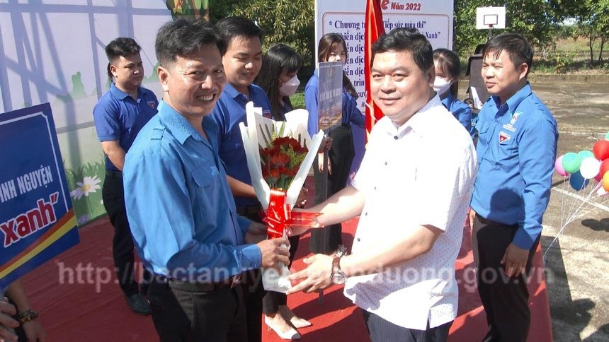 Ông Trần Văn Phương - Phó Chủ tịch UBND huyện, Trưởng Ban chỉ đạo Các hoạt động thanh thiếu nhi huyện tặng hoa chúc mừng đội hình thanh niên tình nguyện hè năm 2022