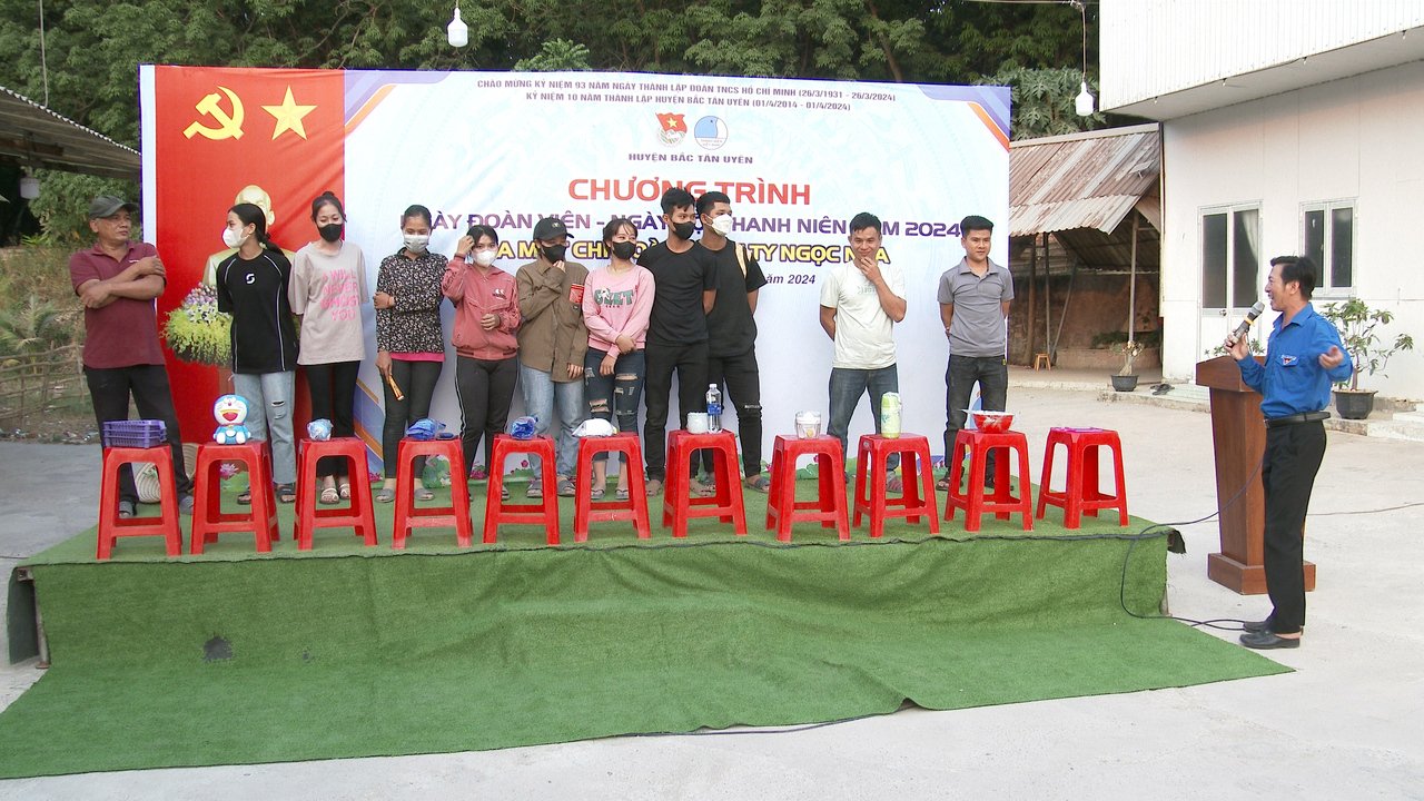 Sáng ngày 23/3, tại Công ty gỗ Ngọc Nga xã Tân Mỹ, Huyện Đoàn Bắc Tân Uyên phối hợp Đảng ủy, BTC Đề án Đoàn kết tập hợp TNCN xã Tân Mỹ tổ chức Ngày đoàn viên – Ngày hội thanh niên công nhân năm 2024 và ra mắt chi đoàn Công ty gỗ Ngọc Nga. Tham dự Ngày hội có đồng chí Đỗ Ngọc Lợi - Bí thư huyện đoàn; đồng chí Lê Thị Hồng Hoa - Chuyên viên Ban tổ chức huyện ủy; đồng chí Thái Hồ Tuyết Minh - Phó Bí thư Đảng ủy xã Tân Mỹ; Đại diện Công ty gỗ Ngọc Nga, cùng đại diện lãnh đạo ban, ngành đoàn thể xã và gần 50 đoàn viên thanh niên.