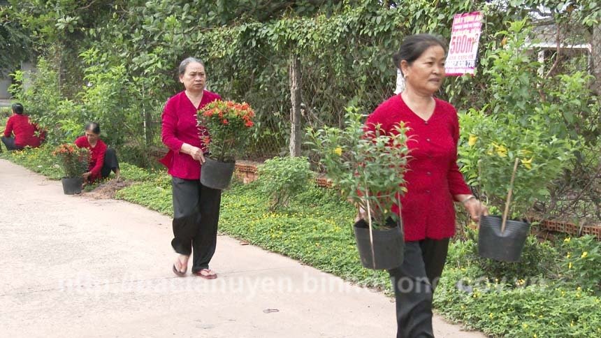 Các chị hội viên phụ nữ xã Tân Định tham gia trồng hoa tuyến đường tự quản