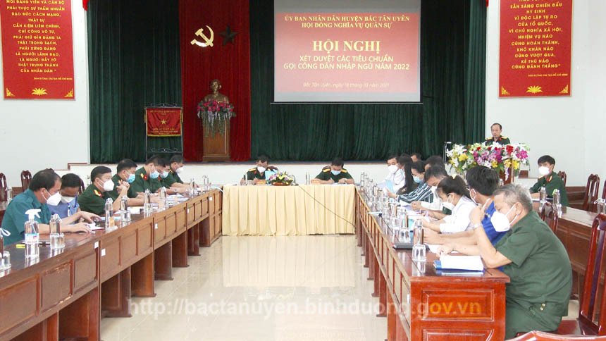 Ngày 18-10, Hội đồng nghĩa vụ Quân sự huyện Bắc Tân Uyên tổ chức Hội nghị xét duyệt các tiêu chuẩn gọi công dân nhập ngũ năm 2022. Đến dự Hội nghị có Đại tá Nguyễn Thanh Tâm – Phó Chỉ huy trưởng, Tham mưu trưởng Bộ Chỉ huy Quân sự tỉnh Bình Dương; Thượng tá Nguyễn Thế Minh – Phó Tham mưu trưởng Bộ Chỉ huy Quân sự tỉnh; Thượng tá Lê Văn Toàn – Chỉ huy trưởng Ban CHQS huyện, cùng dự có các đồng chí thành viên Hội đồng nghĩa vụ Quân sự huyện và Hội đồng nghĩa vụ Quân sự xã, thị trấn.