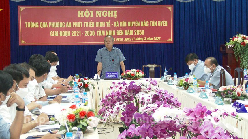 Sáng 11-3, Ủy ban nhân dân huyện Bắc Tân Uyên tổ chức Hội nghị triển khai phương án phát triển kinh tế - xã hội huyện giai đoạn 2021 – 2030, tầm nhìn đến năm 2050. Đồng chí Thái Thanh Bình – Bí thư Huyện ủy, Chủ tịch UBND huyện chủ trì hội nghị, tham dự hội nghị có các đồng chí lãnh đạo các phòng, ban và lãnh đạo Đảng ủy, UBND các xã, thị trấn trên địa bàn huyện.