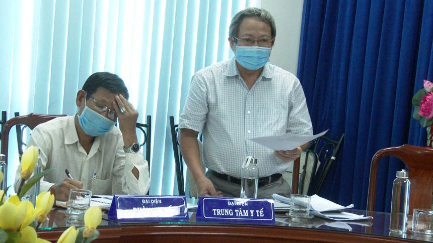 Bác sĩ Nguyễn Văn Thệ, Giám đốc Trung tâm y tế huyện trình bày phương án phòng, chống dịch bệnh Covid-19 tại cơ sở sản xuất, kinh doanh trên địa bàn huyện