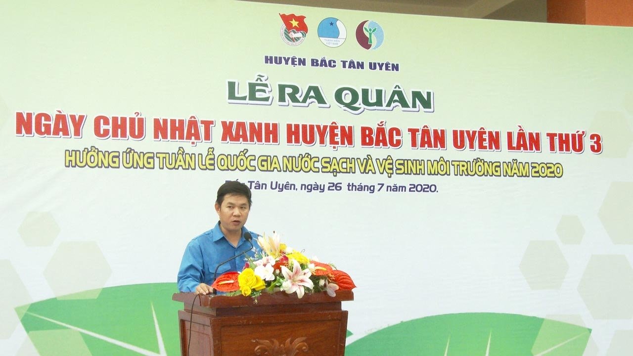 Phát biểu phát động tại buổi lễ, ông Đỗ Ngọc Lợi-Bí thư Huyện đoàn Bắc Tân Uyên khẳng định đây là một hoạt động có ý nghĩa thiết thực trong việc tuyên truyền trong thanh niên, học sinh và nhân dân ý thức giữ gìn và bảo vệ môi trường bằng những việc làm thiết thực. Để Ngày Chủ nhật Xanh huyện diễn ra có hiệu quả ông Đỗ Ngọc Lợi đề nghị các cơ sở đoàn tích cực tuyên truyền về công tác bảo vệ môi trường trong đoàn viên thanh niên và quần chúng nhân dân; xác định việc bảo vệ môi trường là việc làm thường xuyên và trách nhiệm của tuổi trẻ đối với cộng đồng; xây dựng kế hoạch thực hiện bảo vệ môi trường ngay tại cơ quan, đơn vị, các bia tưởng niệm, khu di tích trên địa bàn để giáo dục cho đoàn viên, thanh niên về ý thức bảo vệ môi trường sống sung quanh; chọn những phần việc phù hợp để thực hiện công trình, phần việc trong đợt ra quân thực hiện Ngày Chủ nhật Xanh; tạo điều kiện cho đoàn viên thanh niên phát huy tính xung kích, tình nguyện của tuổi trẻ trong việc chung tay cùng cộng đồng bảo vệ môi trường bằng việc làm cụ thể.