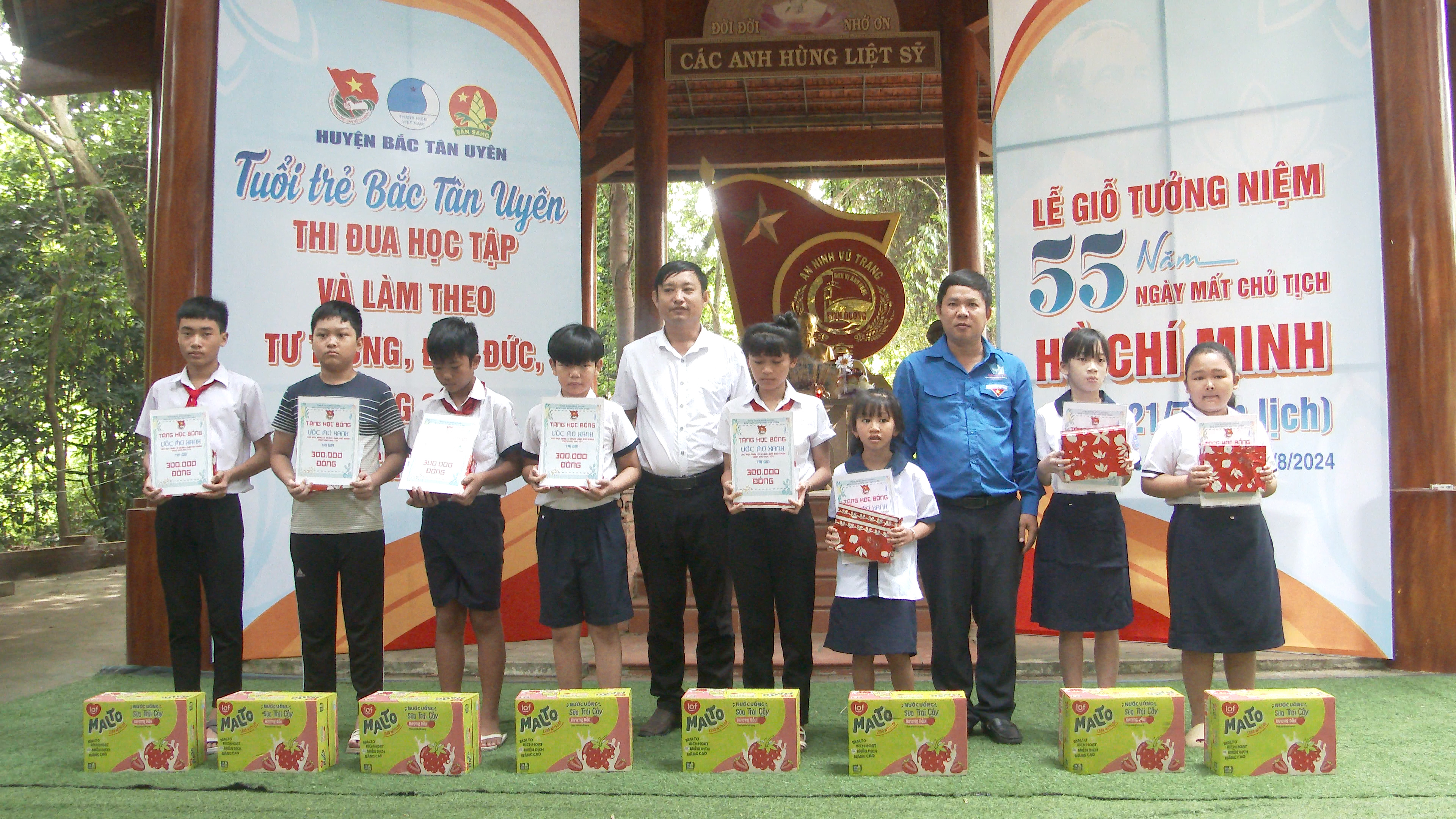 Cũng tại buổi lễ, Huyện đoàn Bắc Tân Uyên đã trao tặng 10 suất học bổng, mỗi suất trị giá 300 ngàn đồng và 10 phần quà, mỗi phần trị giá 500 ngàn đồng cho các em thiếu nhi vượt khó học tốt trên địa bàn xã Bình Mỹ và thị trấn Tân Bình. BCH Đoàn thị trấn Tân Bình và xã Bình Mỹ đã trao tặng 20 chân dung của Bác Hồ cho các chi đoàn trên địa bàn.