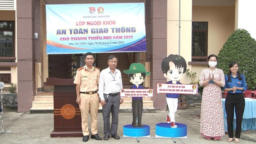 Dịp này, Ban Thường vụ Huyện Đoàn đã trao tặng mô hình nhân vật tuyên truyền an toàn giao thông cho Trường THCS Tân Thành để đặt tại cổng trường với khẩu hiệu “Một ý thức giao thông, triệu nụ cười hạnh phúc”.