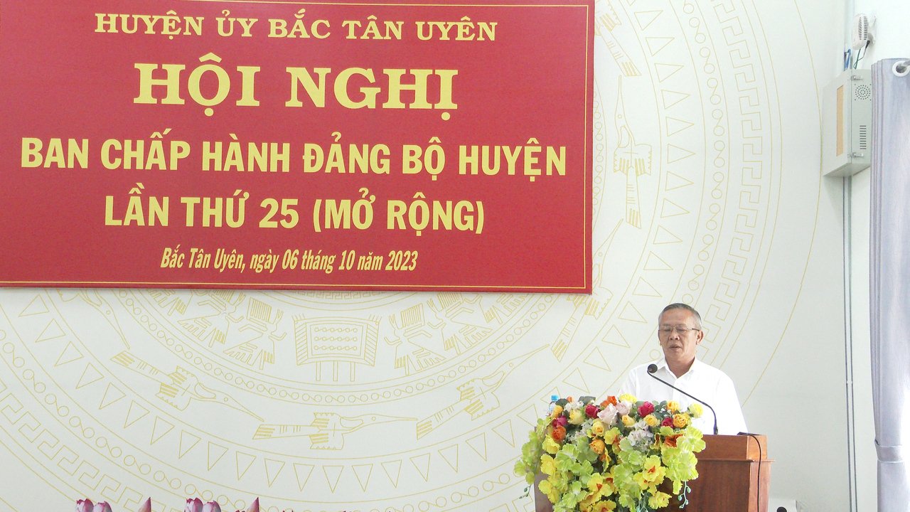 Sáng ngày 06/10/2023, tại Hội trường Huyện uỷ Bắc Tân Uyên tổ chức Hội nghị Ban Chấp hành Đảng bộ huyện lần thứ 25, nhiệm kỳ 2020 - 2025 nhằm sơ kết, đánh giá tình hình kinh tế, xã hội, quốc phòng, an ninh và xây dựng hệ thống chính trị 9 tháng đầu năm, triển khai phương hướng, nhiệm vụ 3 tháng cuối năm 2023. Dự hội và chủ trì Hội nghị có Ông Thái Thanh Bình - Tỉnh uỷ viên, Bí thư Huyện uỷ Bắc Tân Uyên, cùng dự Hội nghị còn có ông Võ Văn Tính - Phó Bí thư Thường trực Huyện uỷ, Chủ tịch HĐND huyện; Ông Nguyễn Thành Thường - Phó Bí thư Huyện uỷ, Chủ tịch UBND huyện cùng các đồng chí Uỷ viên Ban Chấp hành Đảng bộ huyện, lãnh đạo các Ban xây dựng Đảng, Bí thư các cơ sở Đảng trực thuộc, đại diện lãnh đạo các cơ quan, ban, ngành huyện.
