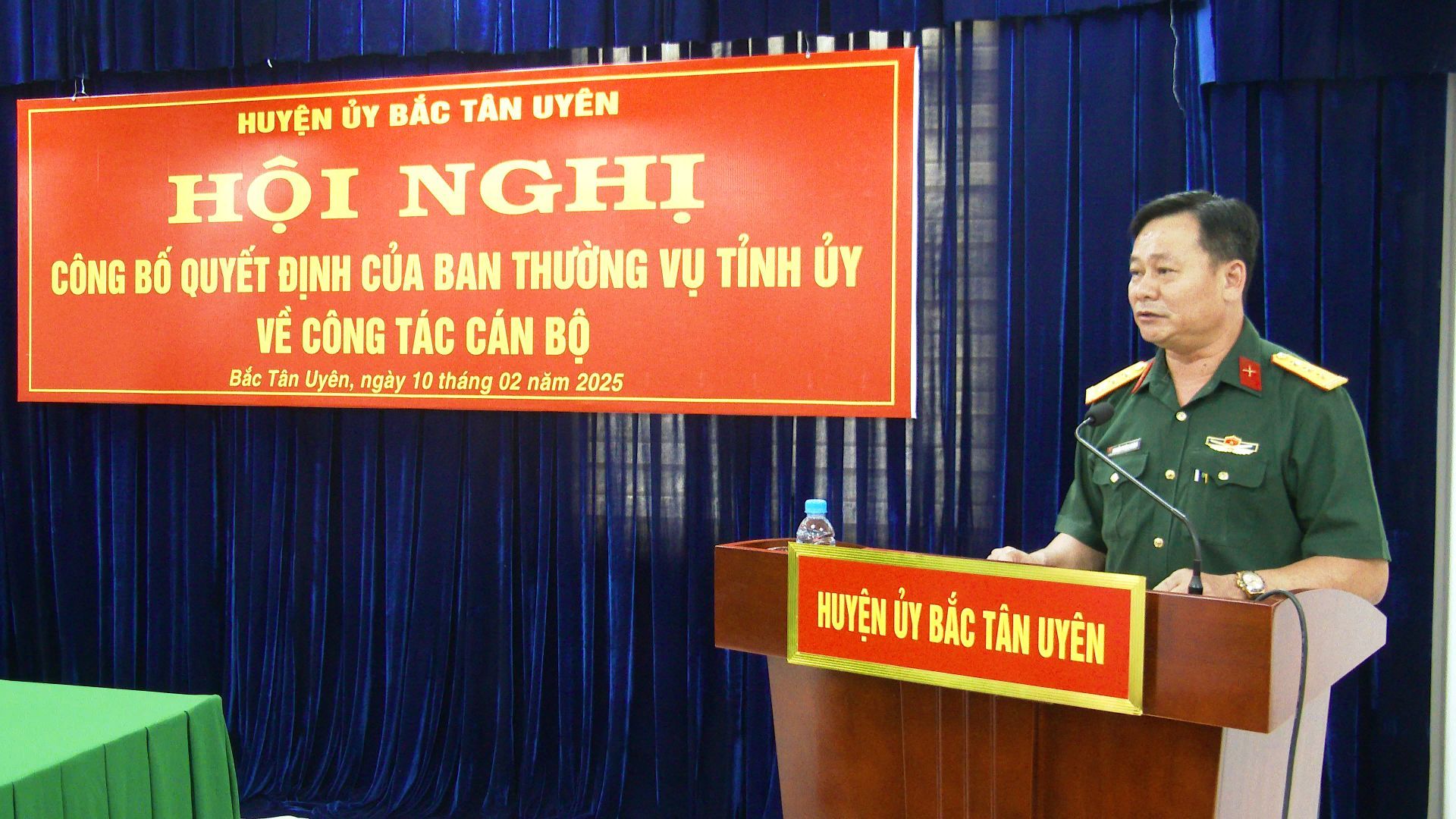 Tại hội nghị, đồng chí Nguyễn Thanh Lâm - Uỷ viên Ban Thường vụ Huyện uỷ, Trưởng ban Tổ chức Huyện uỷ đã công bố quyết định của Ban Thường vụ Tỉnh ủy chỉ định đồng chí Nguyễn Phương Khánh - Chỉ huy Trưởng Ban CHQS huyện giữ chức Ủy viên Ban Thường vụ Huyện ủy Bắc Tân Uyên, nhiệm kỳ 2020-2025.