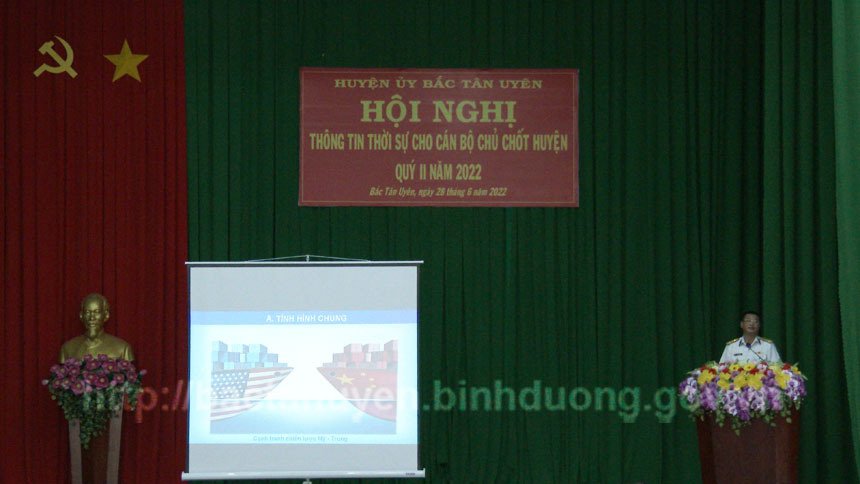 Chiều ngày 28-6, Huyện ủy Bắc Tân Uyên tổ chức Hội nghị thông tin thời sự cho cán bộ chủ chốt quý II năm 2022. Tham dự Hội nghị có đồng chí Thượng tá Phạm Văn Quý - Phó Chính ủy Hải đoàn 129, Quân chủng Hải quân là báo cáo viên của Hội nghị; đồng chí Trương Văn Phong - Phó Bí thư Huyện ủy chủ trì Hội nghị; các đồng chí Ủy viên Ban Thường vụ Huyện ủy, Thường trực HĐND, UBND, lãnh đạo các Ban xây dựng Đảng, Ủy ban MTTQ huyện; lãnh đạo các cơ quan, ban, ngành, các đoàn thể chính trị - xã hội huyện; lãnh đạo chủ chốt 10 xã, thị trấn.