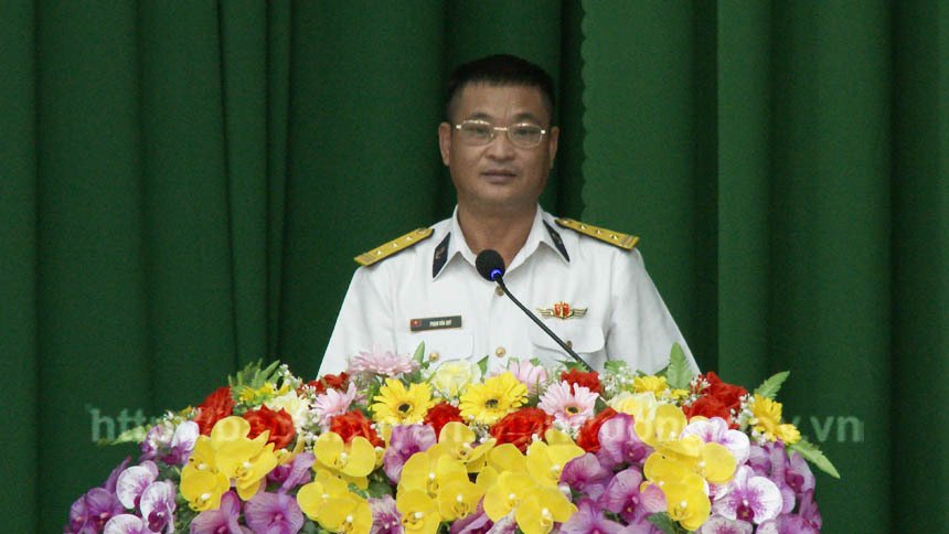 Đồng chí Thượng tá Phạm Văn Quý - Phó Chính ủy Hải đoàn 129, Quân chủng Hải quân thông tin tình hình thời sự cho cán bộ chủ chốt huyện